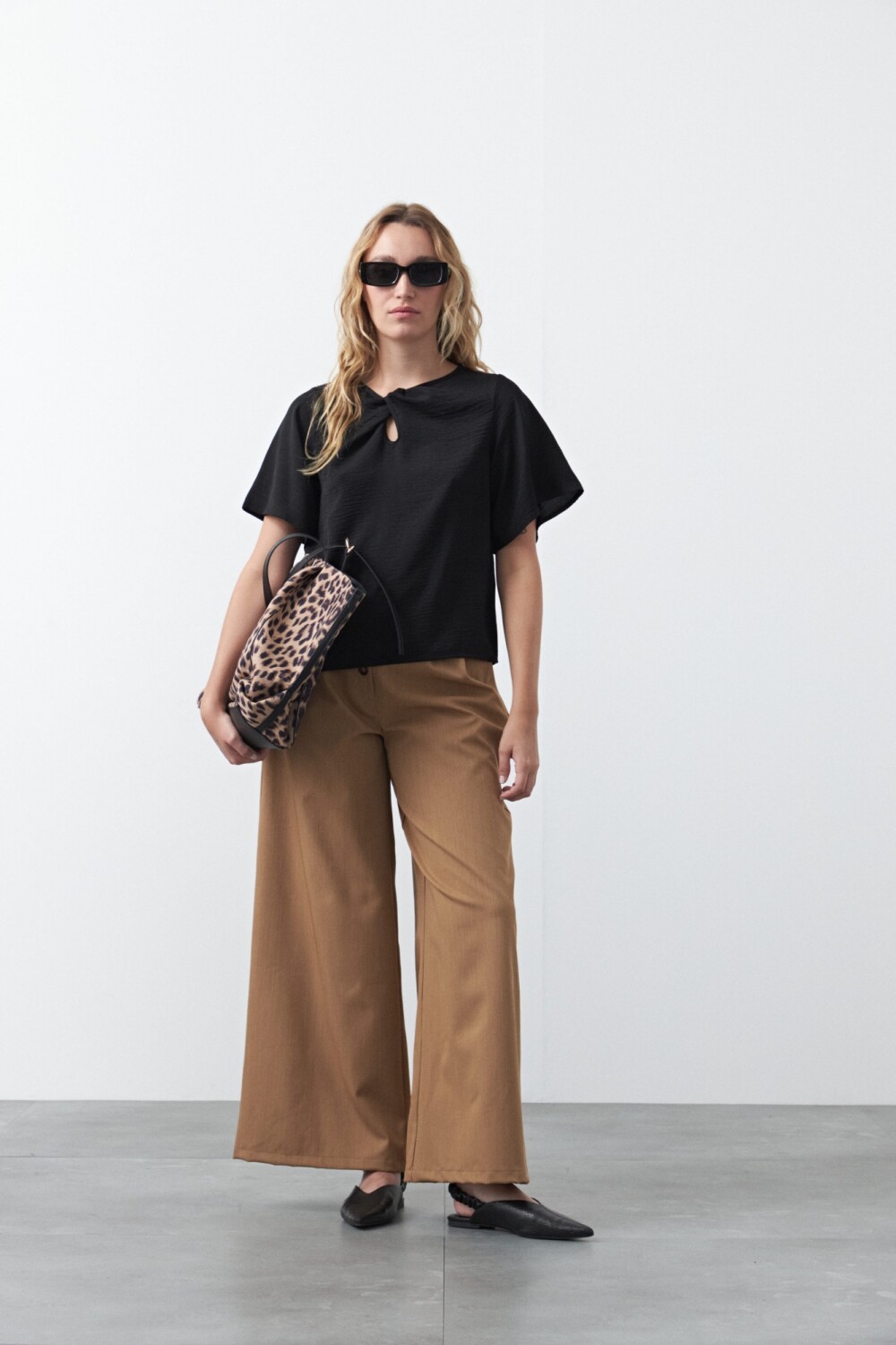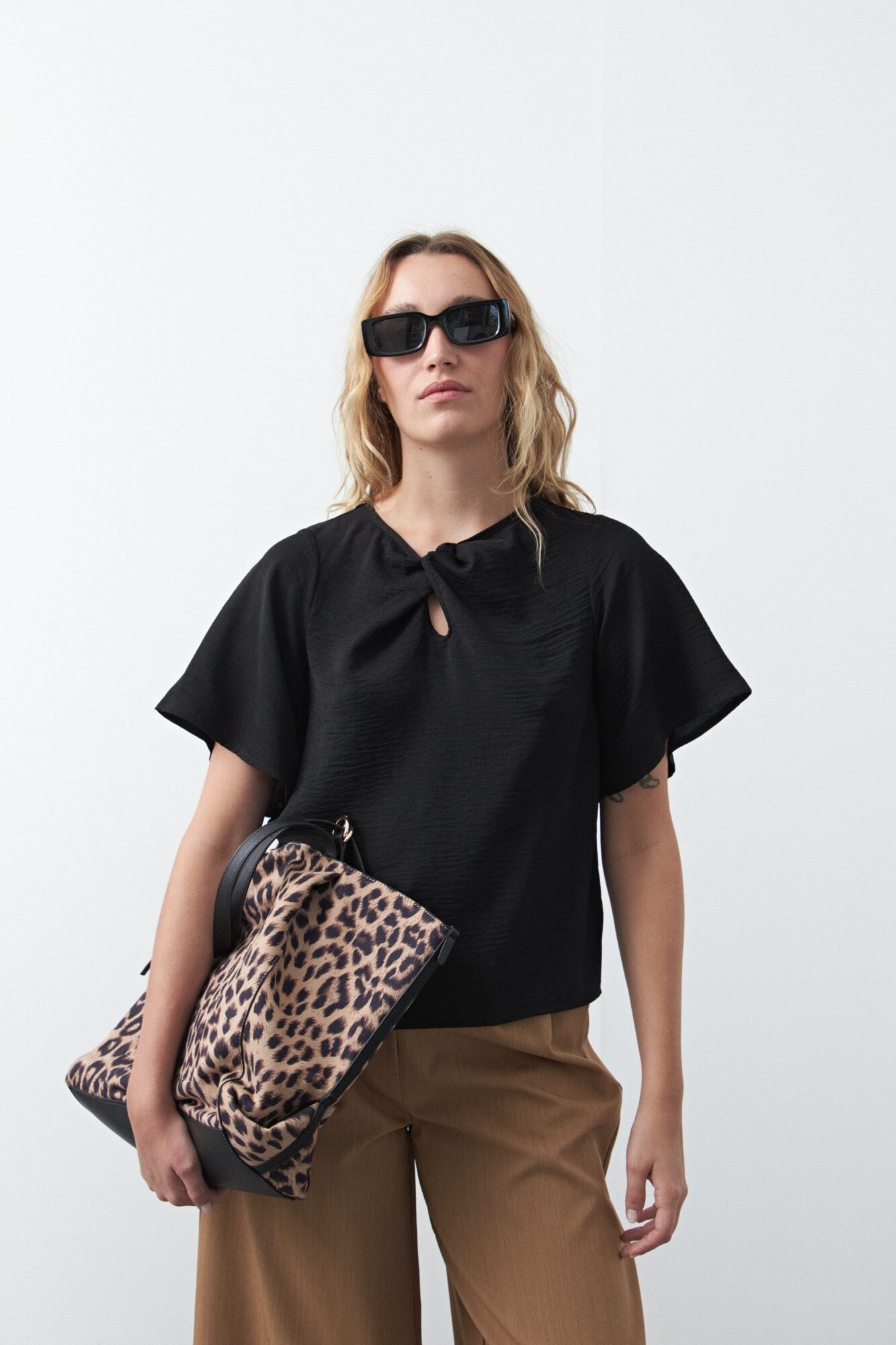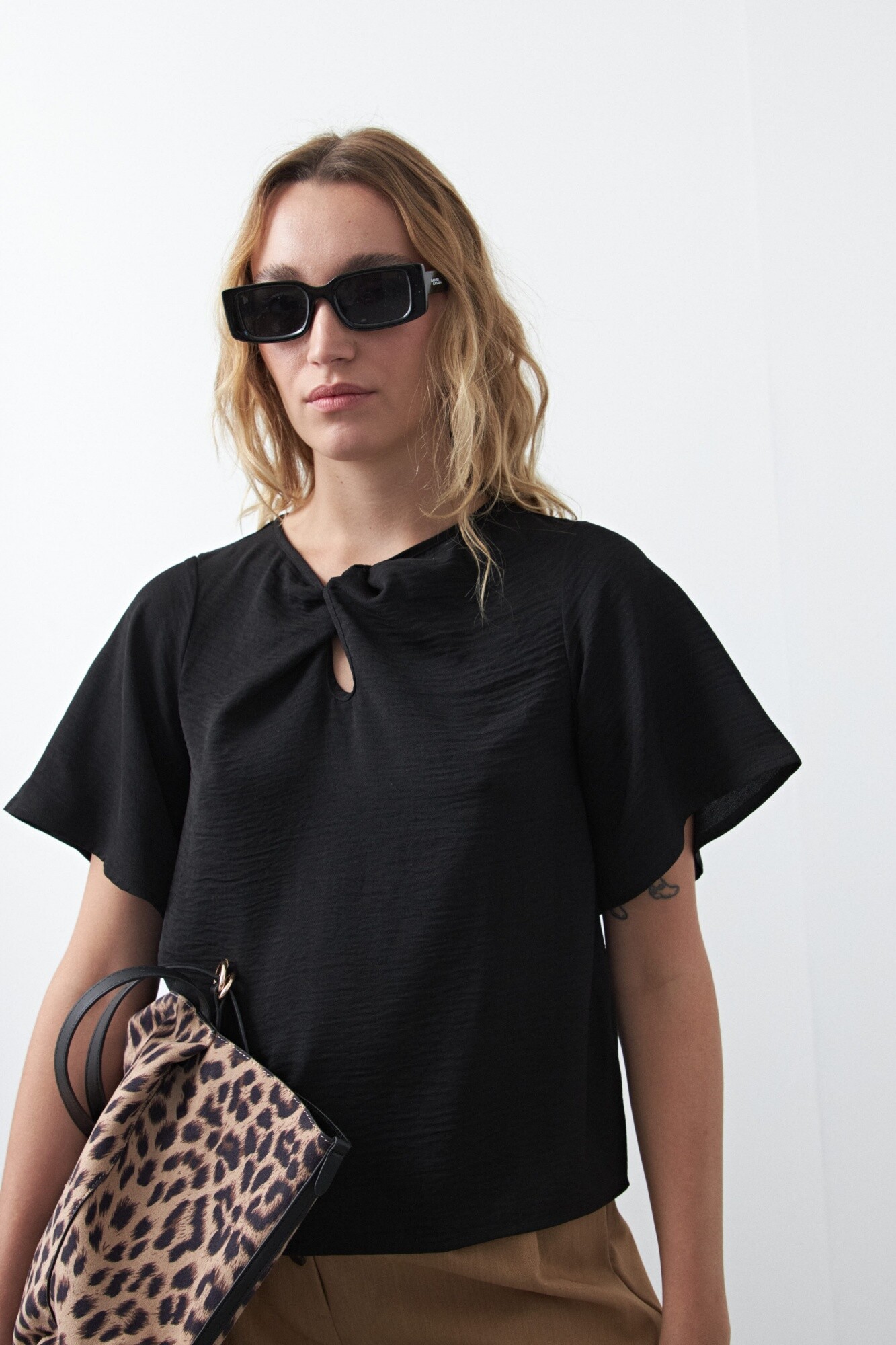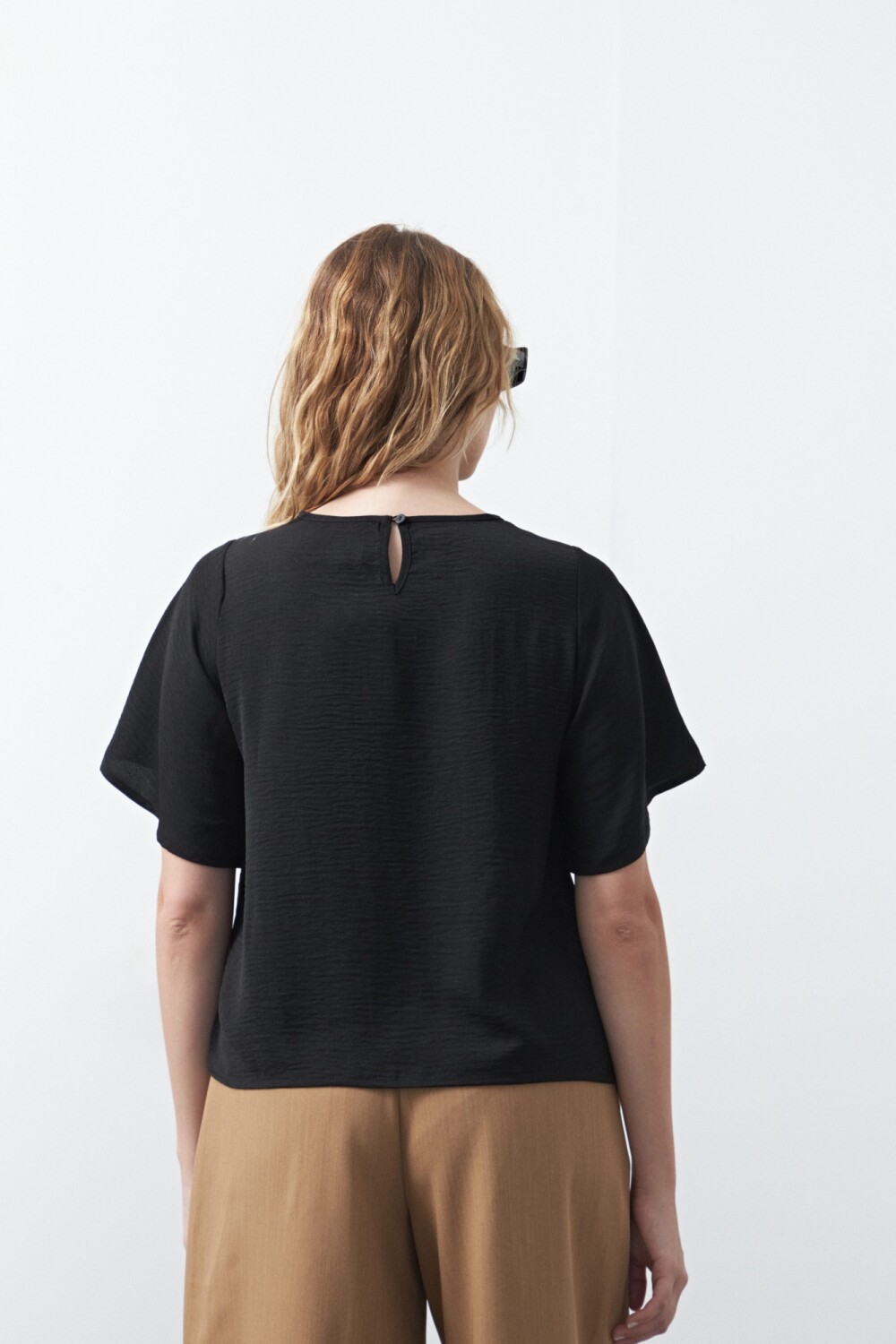Top de manga corta con nudo frontal, pensado como una prenda clave para looks de oficina. El detalle de nudo en el escote aporta diseño y sofisticación sin perder sobriedad, mientras que la silueta relajada garantiza un calce cómodo y prolijo. Ideal para combinar con sastrería y lograr un look profesional con un diferencial sutil.