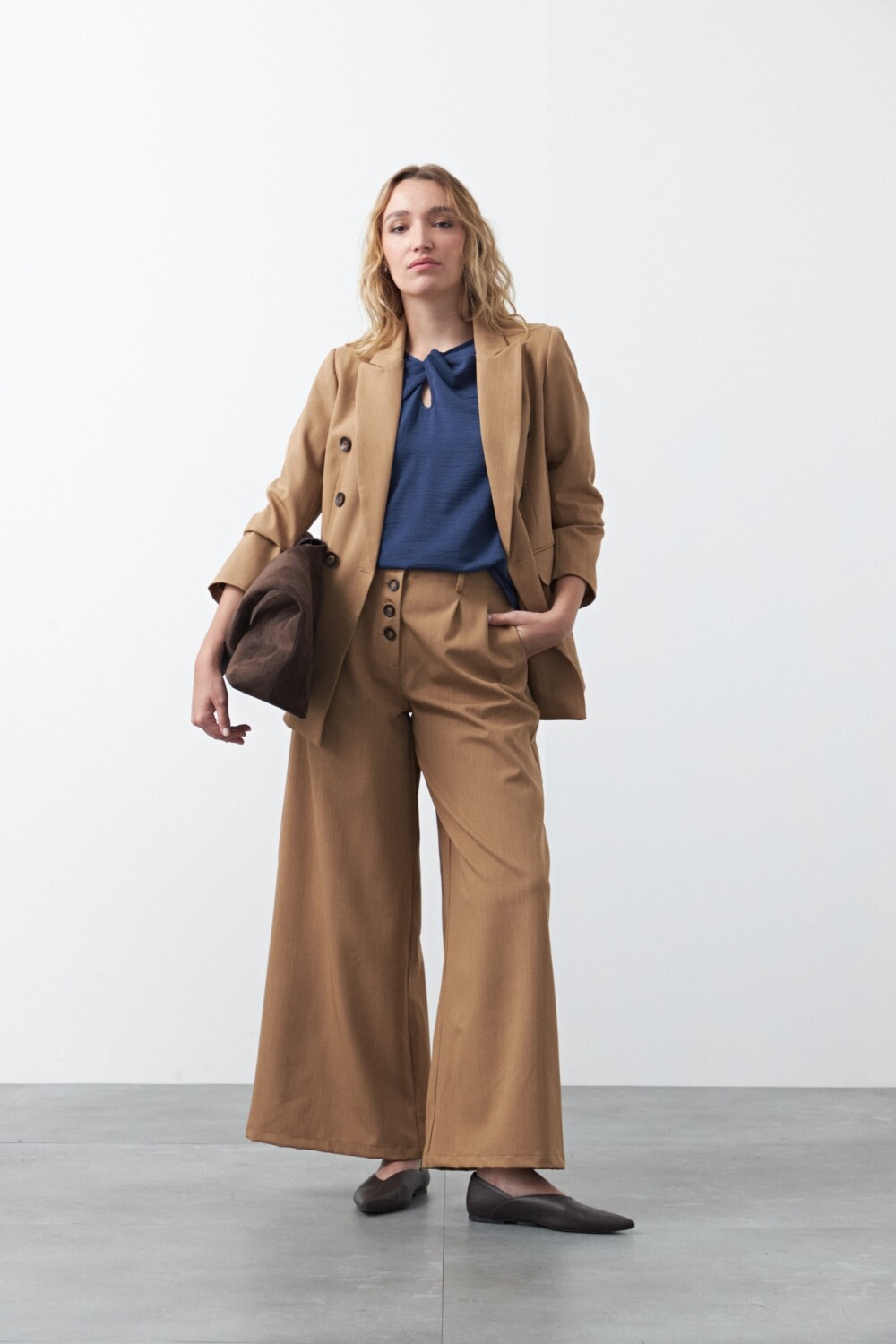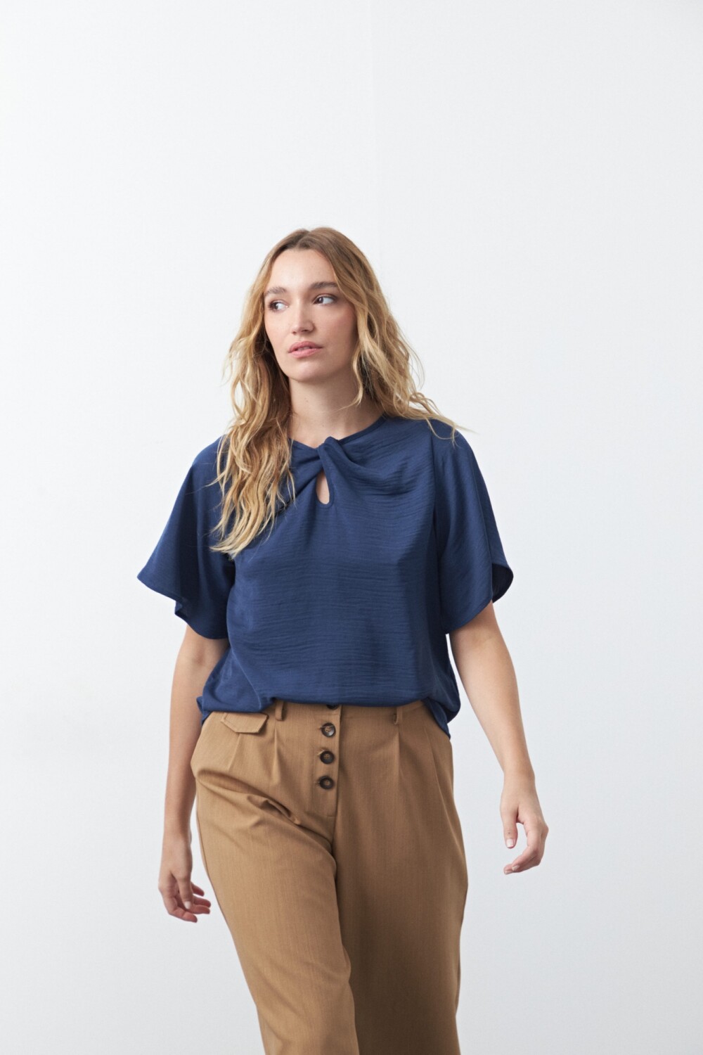 Top de manga corta con nudo frontal, pensado como una prenda clave para looks de oficina. El detalle de nudo en el escote aporta diseño y sofisticación sin perder sobriedad, mientras que la silueta relajada garantiza un calce cómodo y prolijo. Ideal para combinar con sastrería y lograr un look profesional con un diferencial sutil.