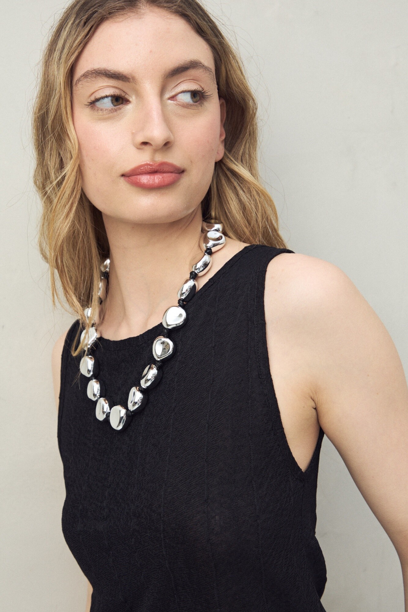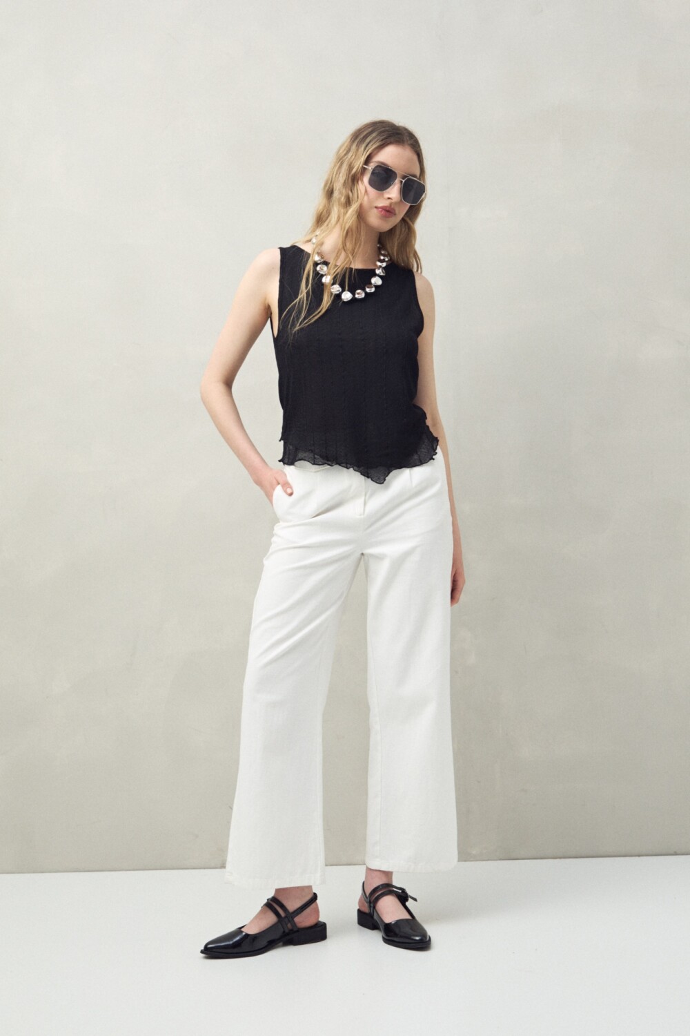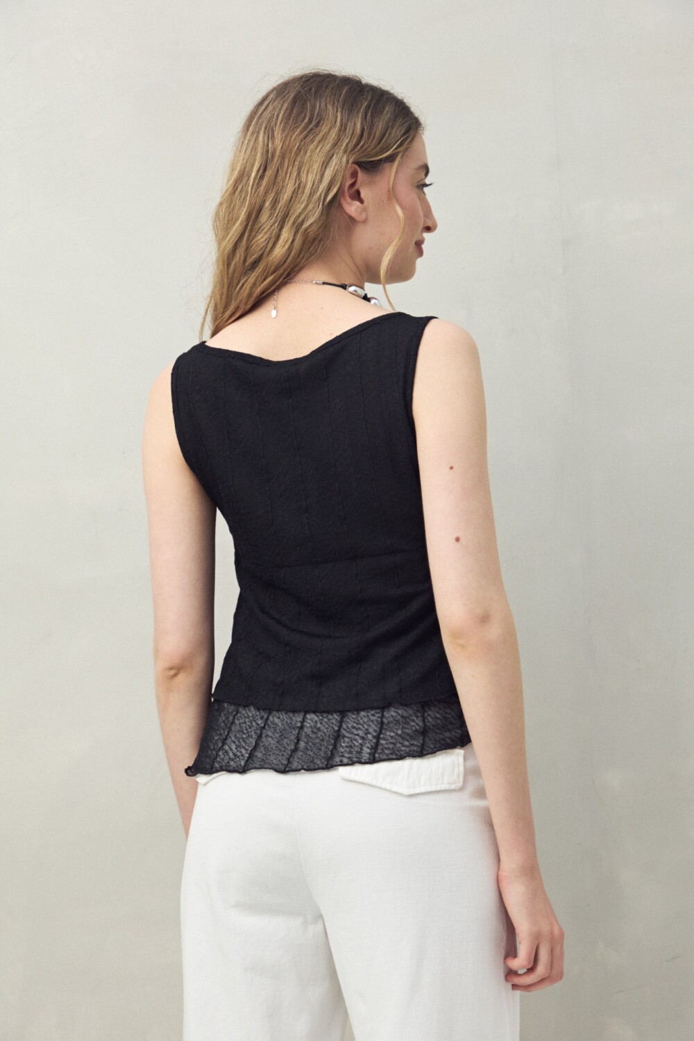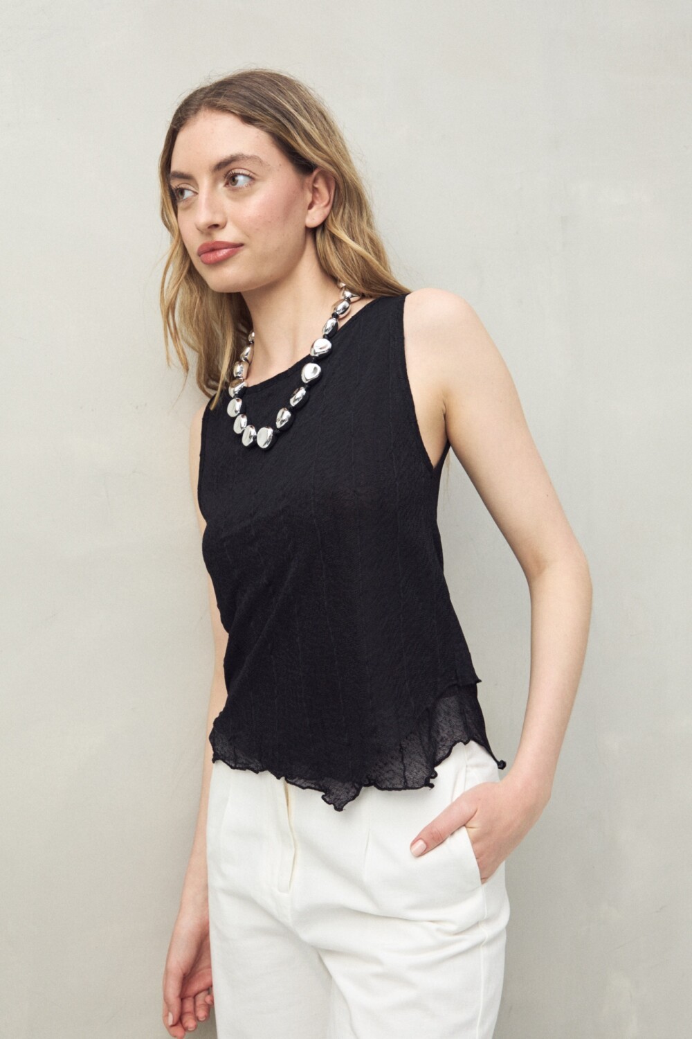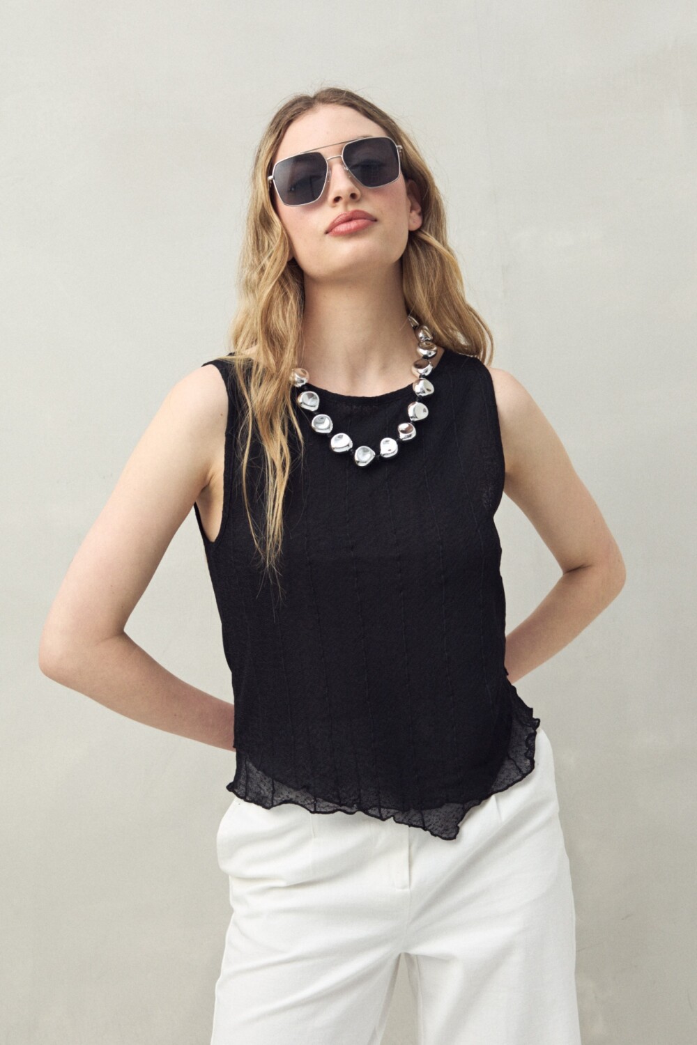 Top sin mangas confeccionado en un tejido liviano con sutil textura y líneas verticales, que estilizan la silueta. Una prenda versátil, pensada tanto para un look de noche como para el día, que se adapta con facilidad a diferentes estilos y ocasiones.