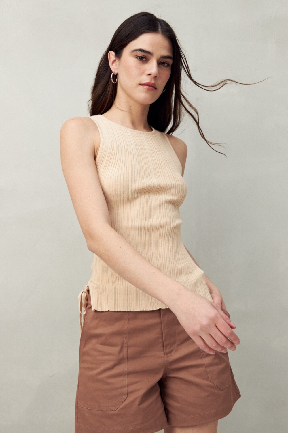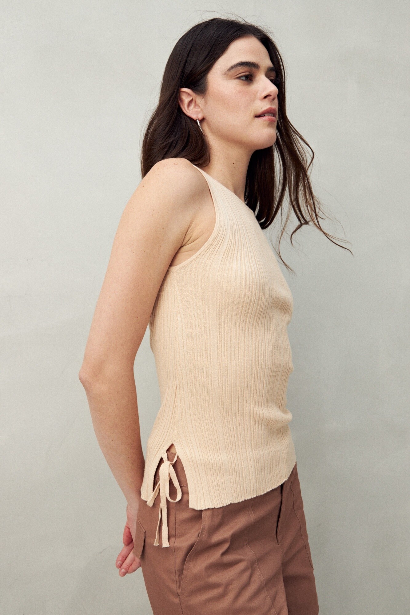 40 Top sin mangas tejido en canalé fino, con detalle de lazo regulable en los laterales que suma un aire delicado y actual. Su fit al cuerpo realza la silueta, mientras que la textura lo convierte en un básico renovado y trendy para combinar con todo!