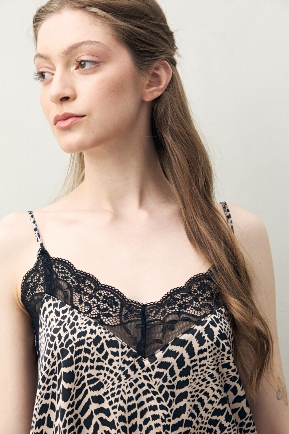 Confeccionado en tejido satinado con leve elasticidad, se destaca por su caída fluida y tacto suave. Presenta escote en V trabajado con encaje floral protagonista, un detalle distintivo que aporta textura, feminidad y un acabado sofisticado. Las tiras finas regulables permiten un calce cómodo y adaptable, acompañando el cuerpo sin ajustar. Una prenda liviana y elegante, ideal para sumar un diferencial al descanso.