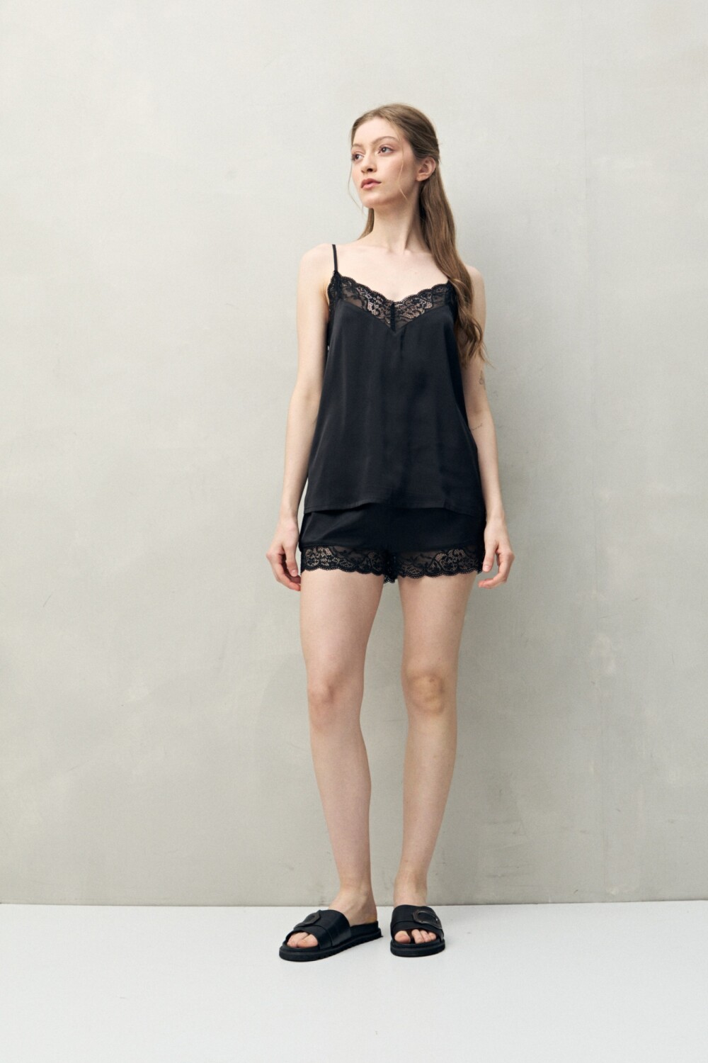 Confeccionado en tejido satinado con leve elasticidad, se distingue por su escote en V trabajado con encaje floral, un detalle característico que aporta textura, feminidad y un acabado sofisticado. Las tiras finas regulables aseguran un calce cómodo, mientras que la caída fluida acompaña el cuerpo con suavidad. Una prenda liviana y elegante, ideal para sumar un diferencial al descanso.