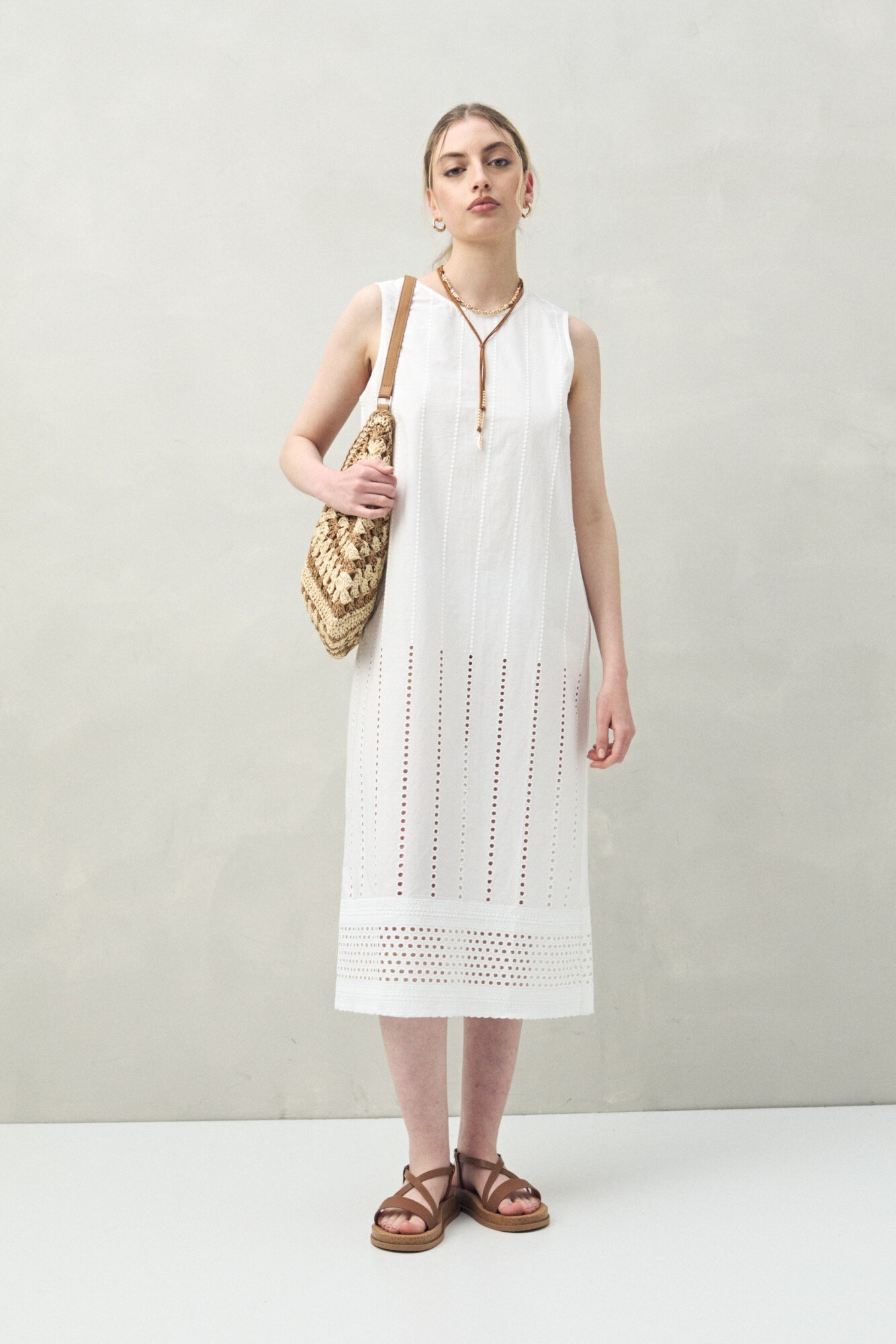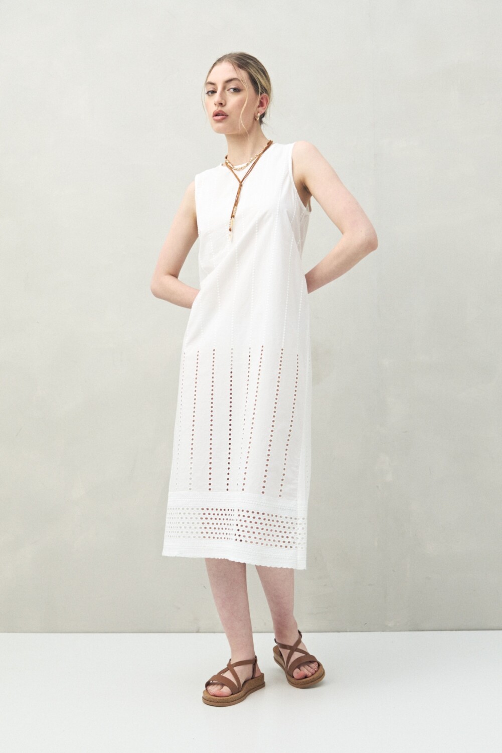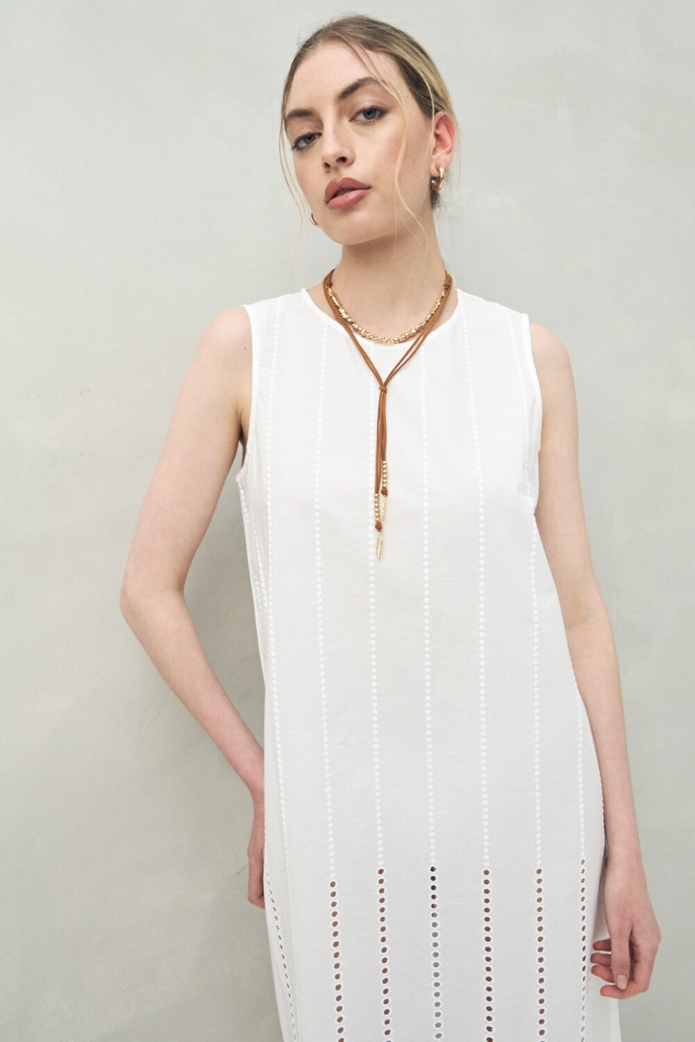 Vestido largo sin mangas confeccionado en algodón con delicados calados verticales y bordado tipo ojo de perdiz. Su silueta recta y liviana transmite frescura y elegancia natural, ideal para un look veraniego con esencia boho chic.