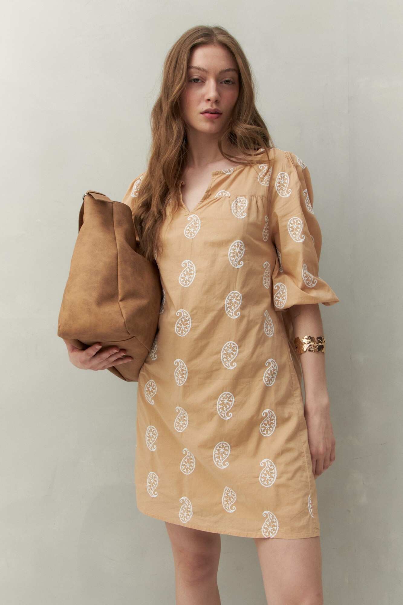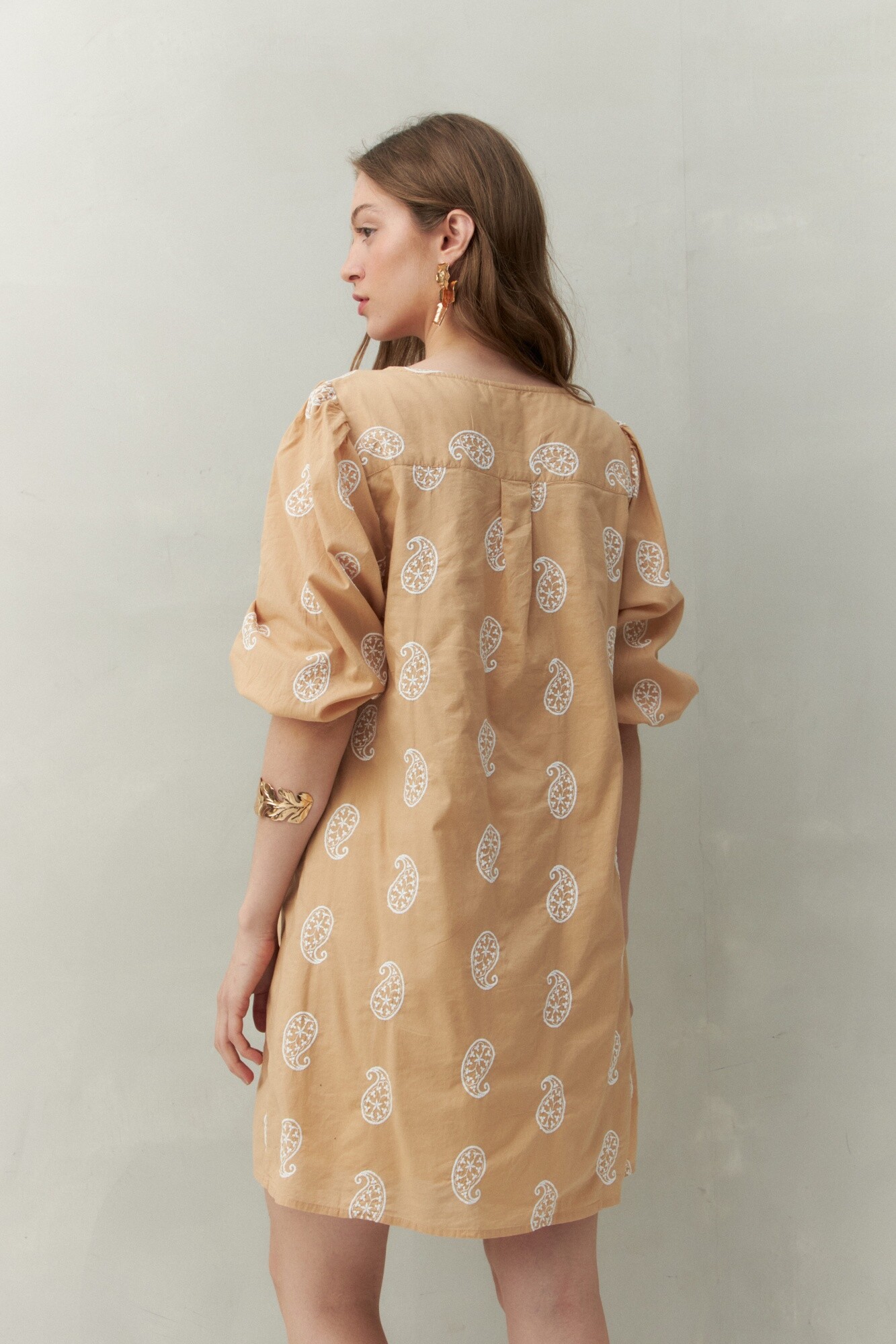 20 Vestido corto con bordado artesanal tipo paisley, confeccionado en algodón puro. Presenta escote en V, mangas 3/4 con elástico y una silueta relajada que aporta movimiento y frescura. Su textura liviana y natural lo convierte en un infaltable para los días cálidos o para un look boho chic en la ciudad. Ideal para combinar con sandalias planas o botas cortas, según la ocasión.