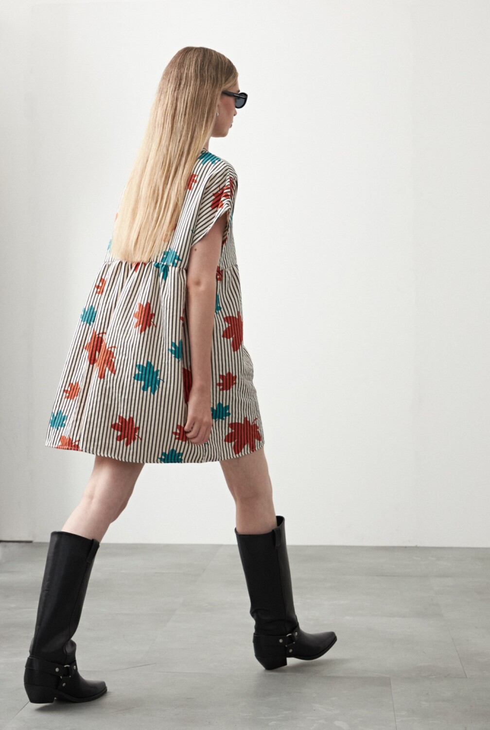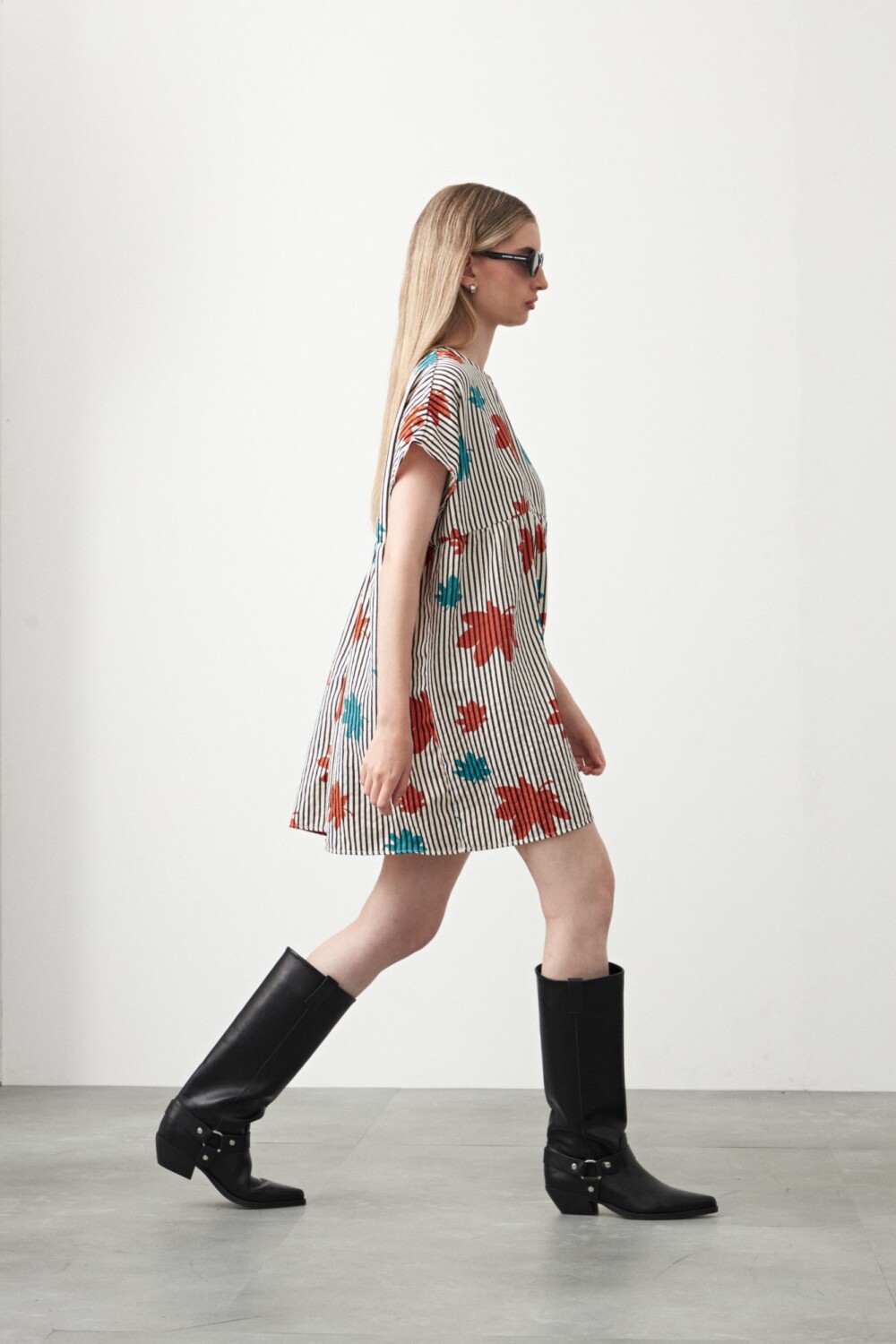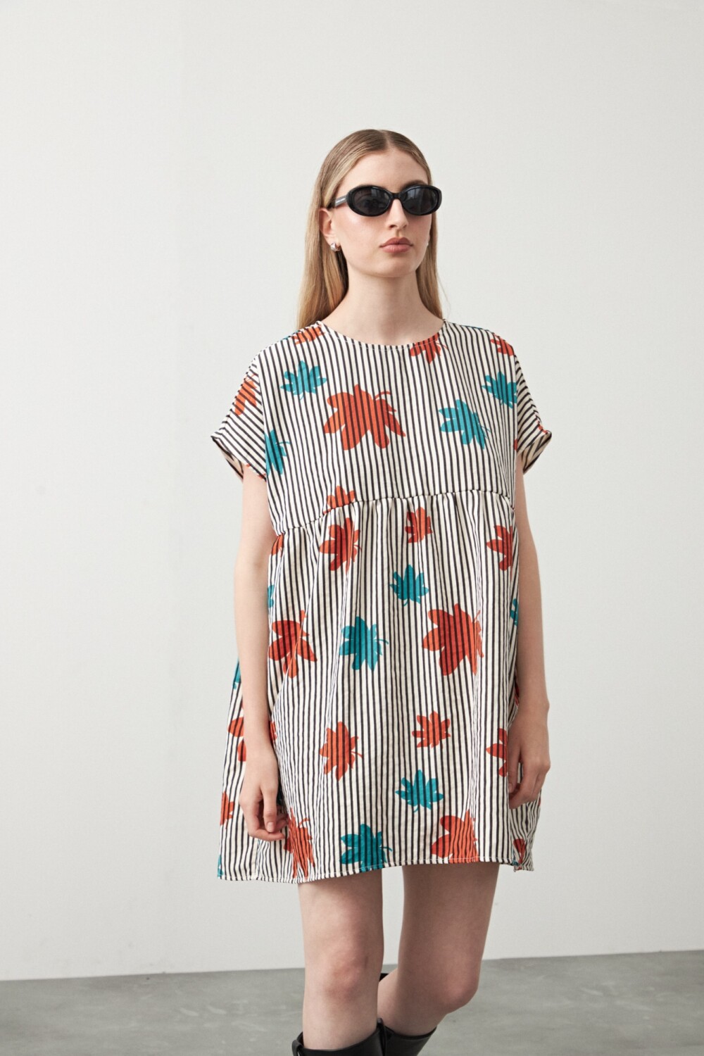 Vestido corto estampado de silueta amplia con corte bajo busto que aporta una caída suelta y movimiento natural. Presenta cuello a la base y mangas cortas con terminación relajada, logrando un diseño cómodo y actual. El tejido liviano acompaña el cuerpo sin ajustar, ideal para usar solo o en capas y sumar un toque trendy a looks de día, clave para elevar cualquier look con facilidad.