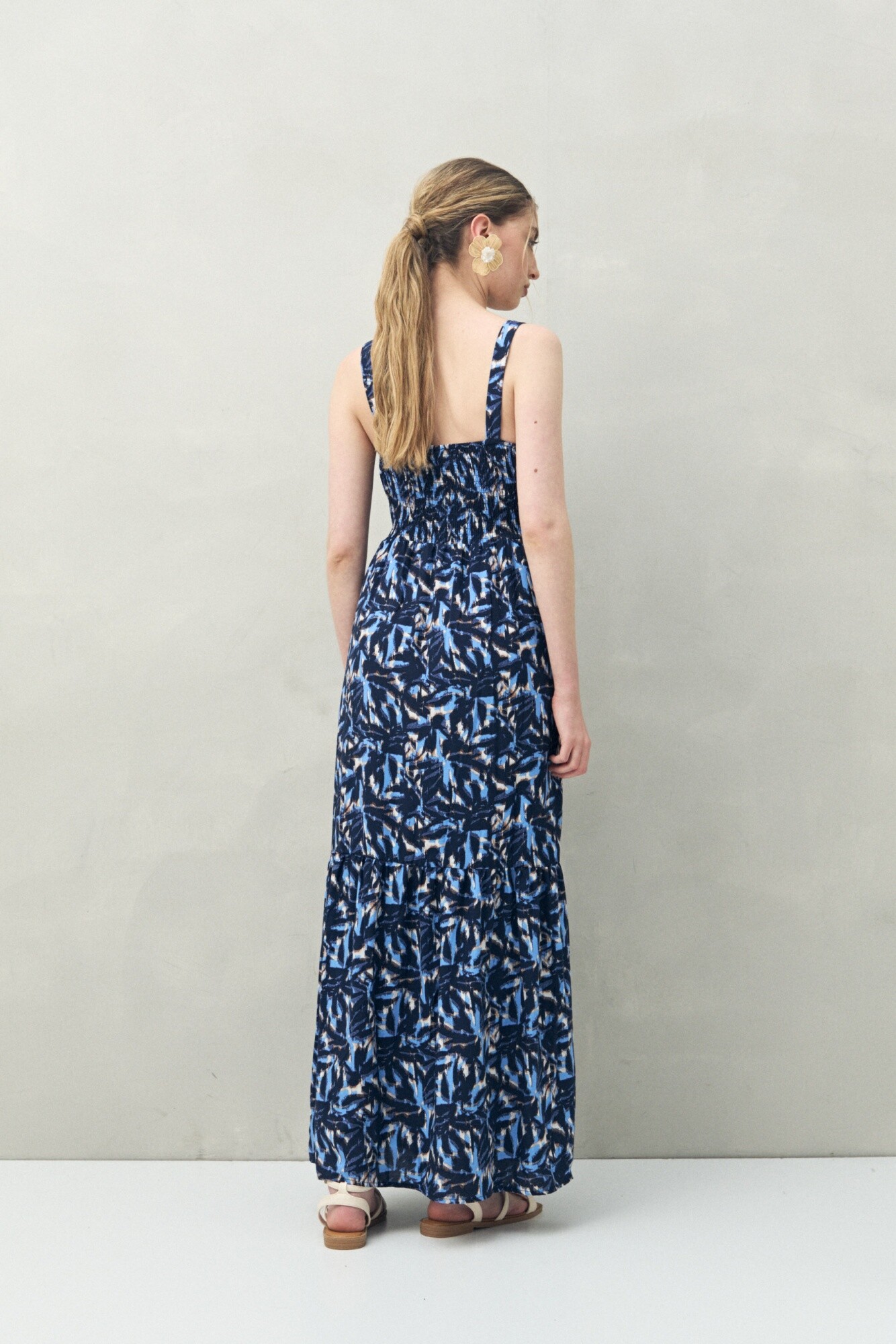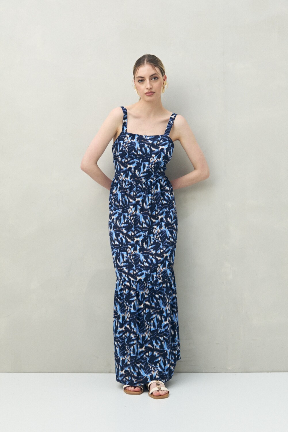 Vestido largo sin mangas con escote recto y breteles anchos.