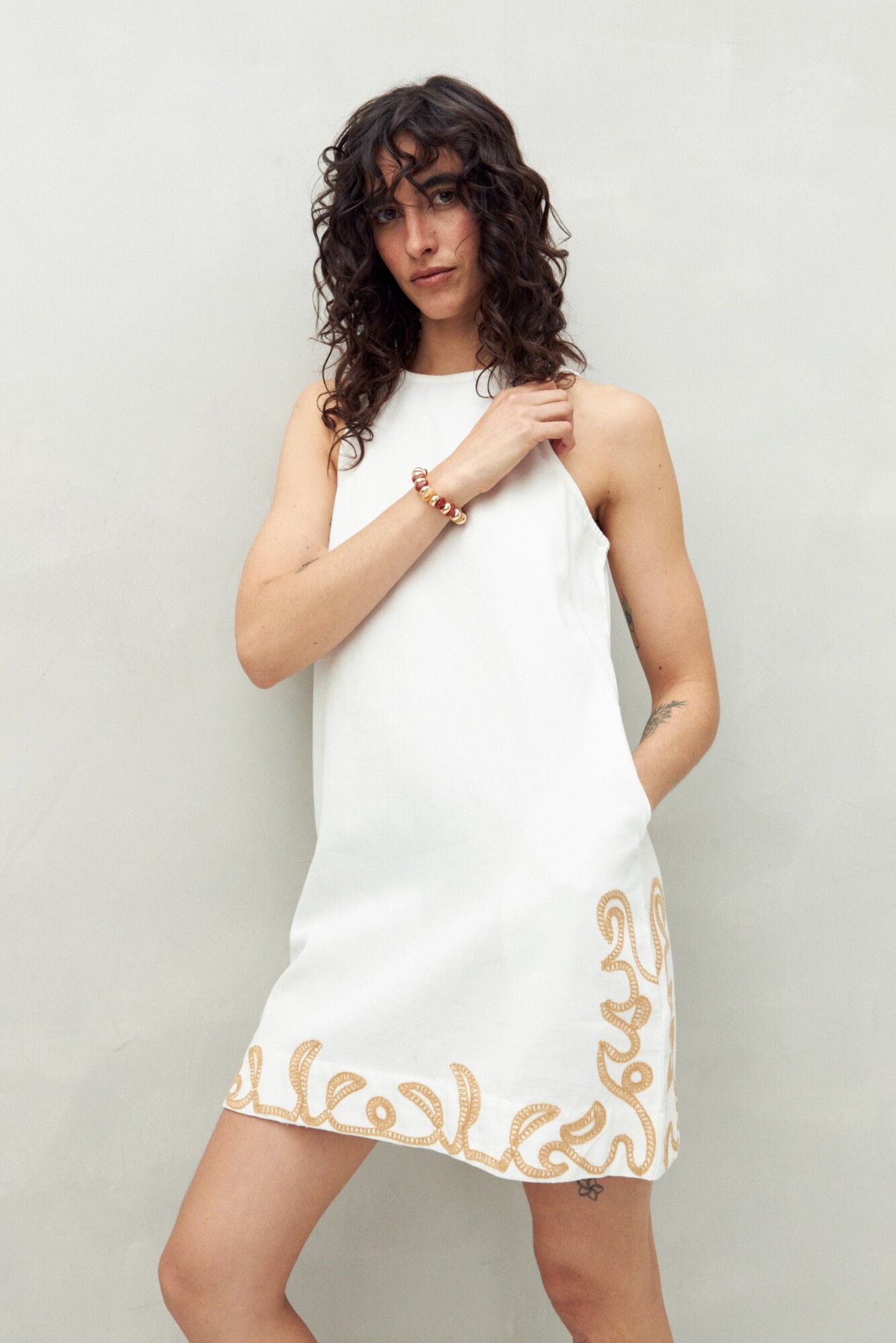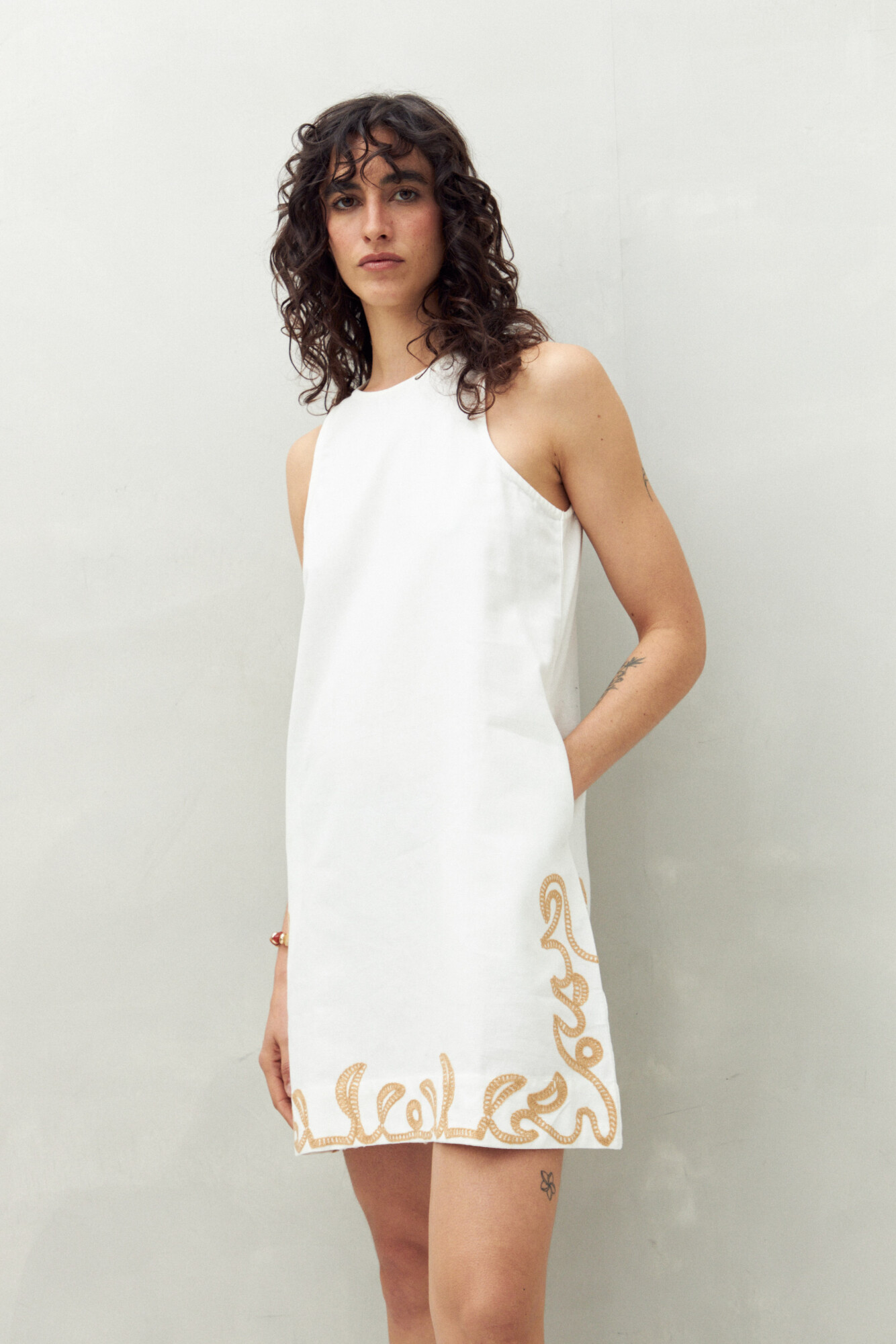 Vestido corto de algodón con bordado artesanal en el ruedo que aporta textura y detalle visual. Su silueta recta y cuello alto le dan un aire moderno y minimalista, ideal para lograr un look fresco con guiños bohemios.