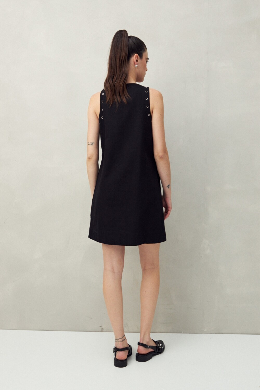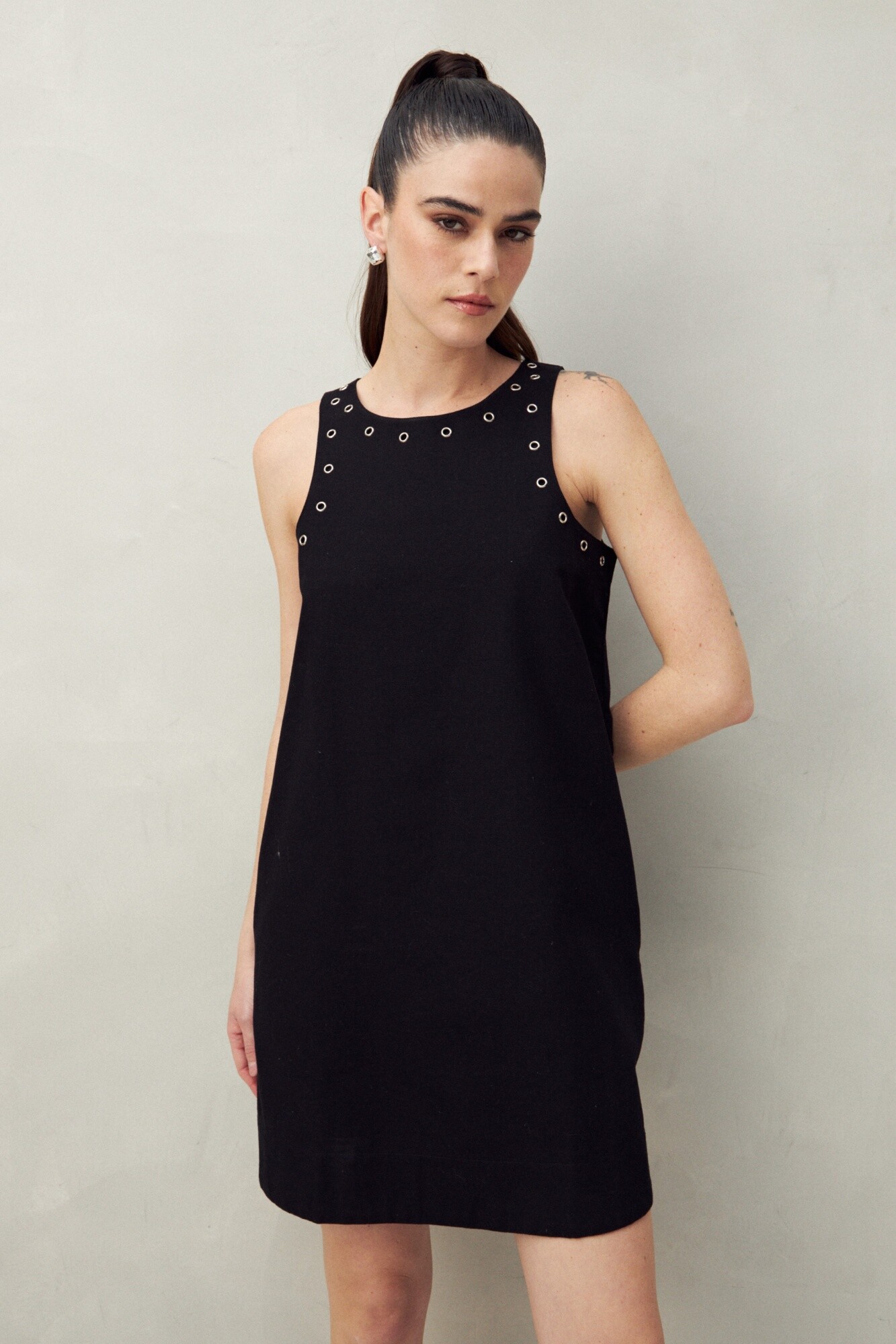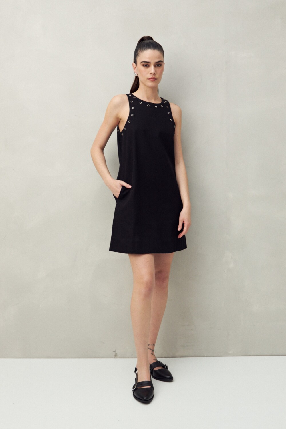20 Vestido corto de silueta recta confeccionado en algodón con apliques metálicos que recorren el escote y las sisas, aportando un toque moderno y urbano. Su diseño minimalista se equilibra con este detalle diferencial, logrando una prenda versátil que puede acompañarte tanto de día como de noche con solo cambiar los accesorios.
