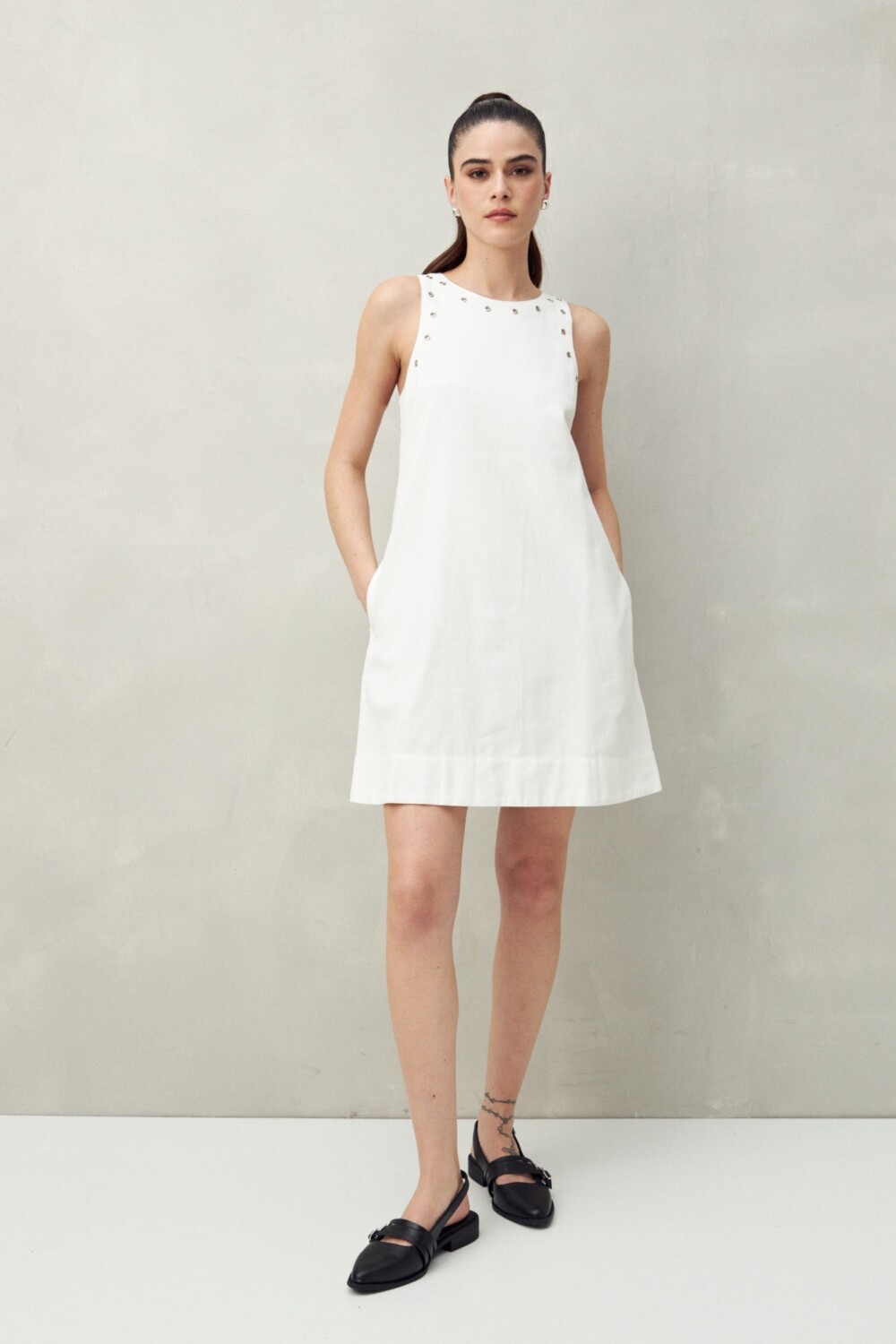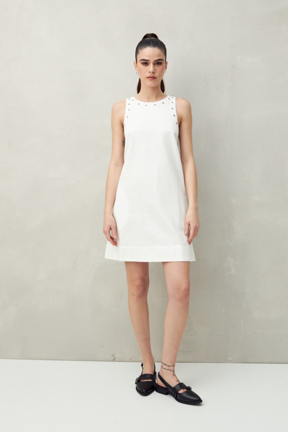 20 Vestido corto de silueta recta confeccionado en algodón con apliques metálicos que recorren el escote y las sisas, aportando un toque moderno y urbano. Su diseño minimalista se equilibra con este detalle diferencial, logrando una prenda versátil que puede acompañarte tanto de día como de noche con solo cambiar los accesorios.
