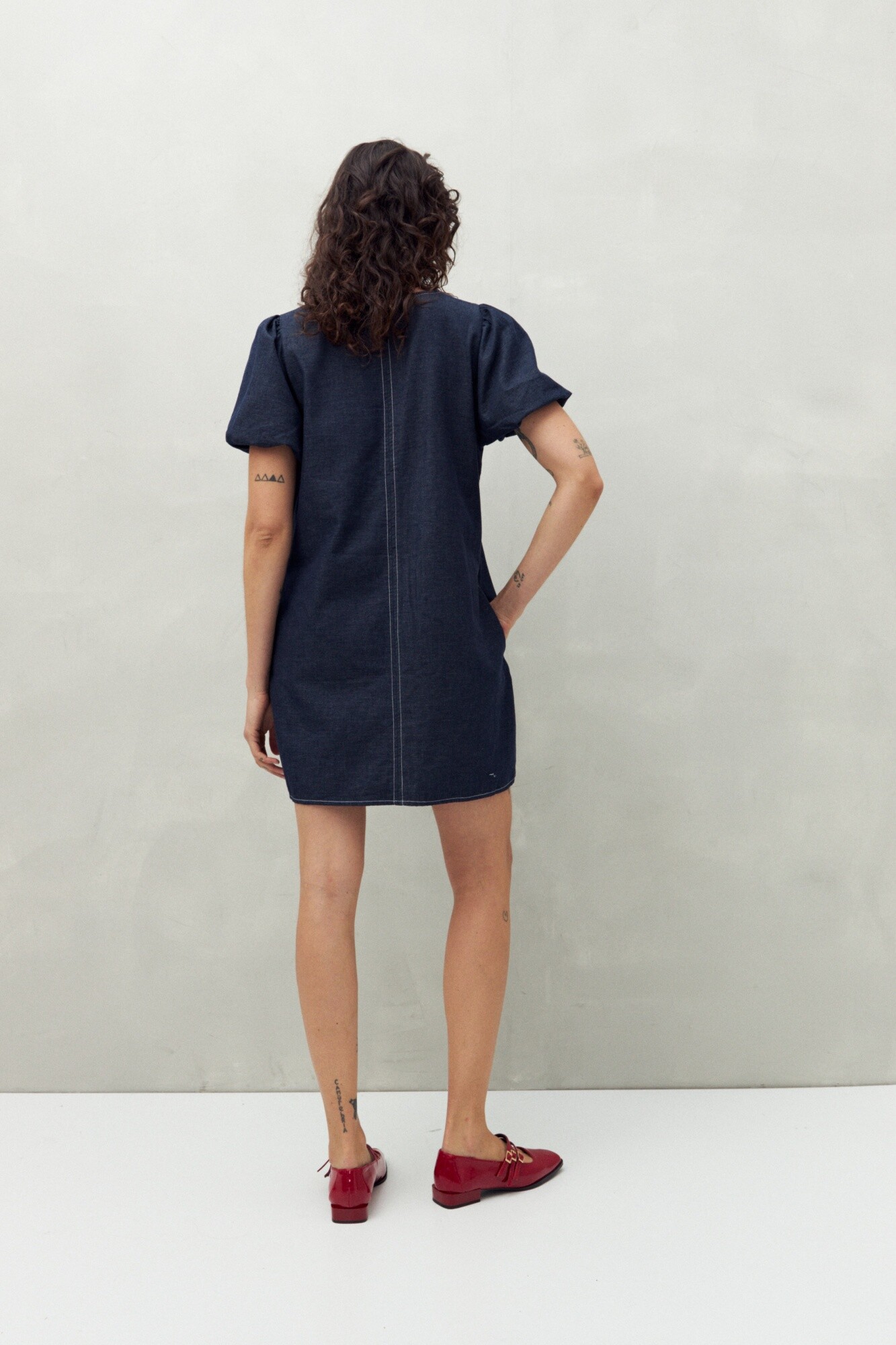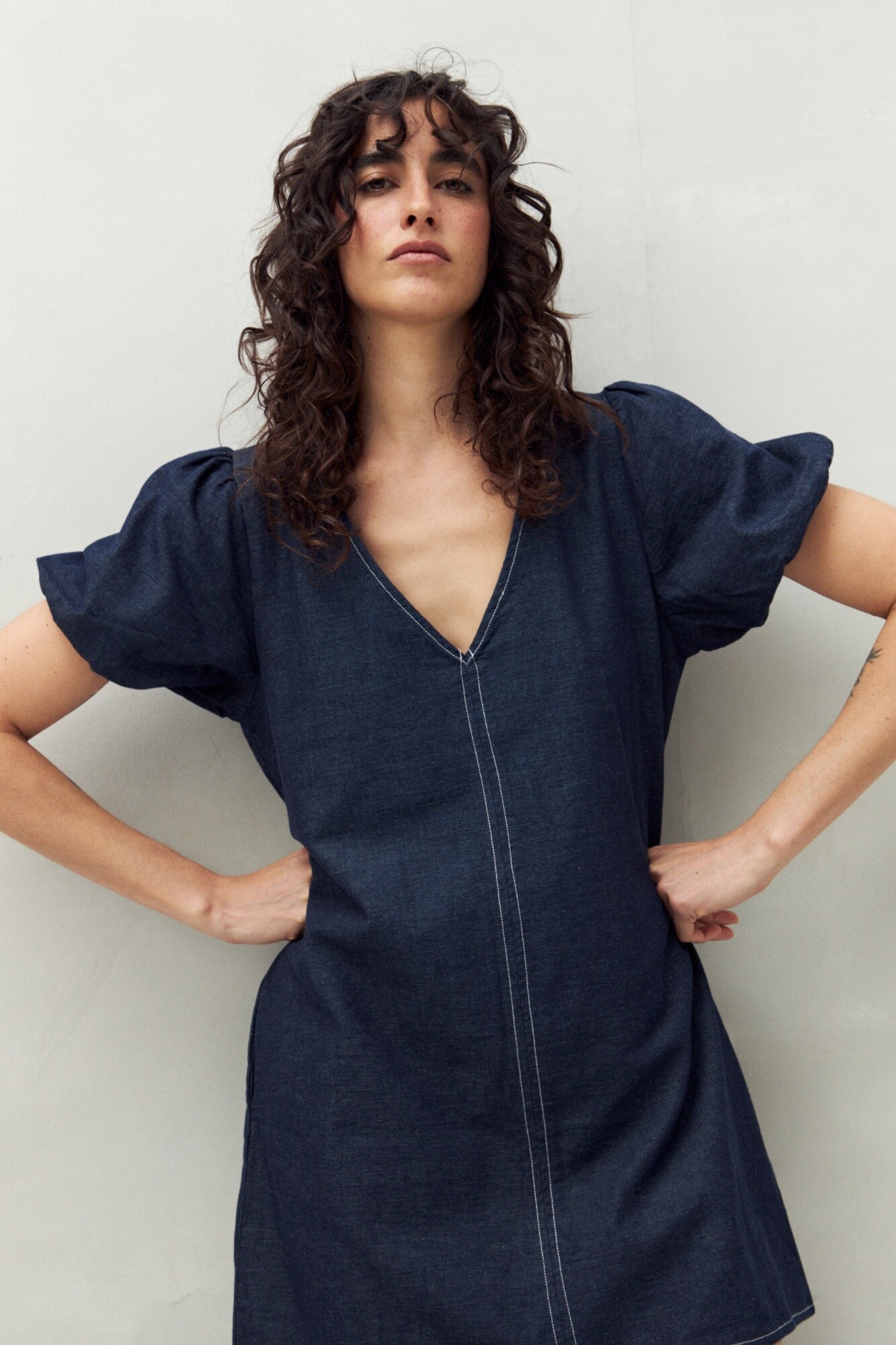 Vestido corto confeccionado en 100% algodón, con un diseño relajado y favorecedor. Presenta escote en V profundo y mangas abullonadas que suman volumen y un aire femenino. Su silueta amplia con costura central estiliza y lo convierte en una opción fresca y cómoda para el día a día. Ideal para llevar con sandalias planas o sneakers y lograr un look trendy sin esfuerzo.