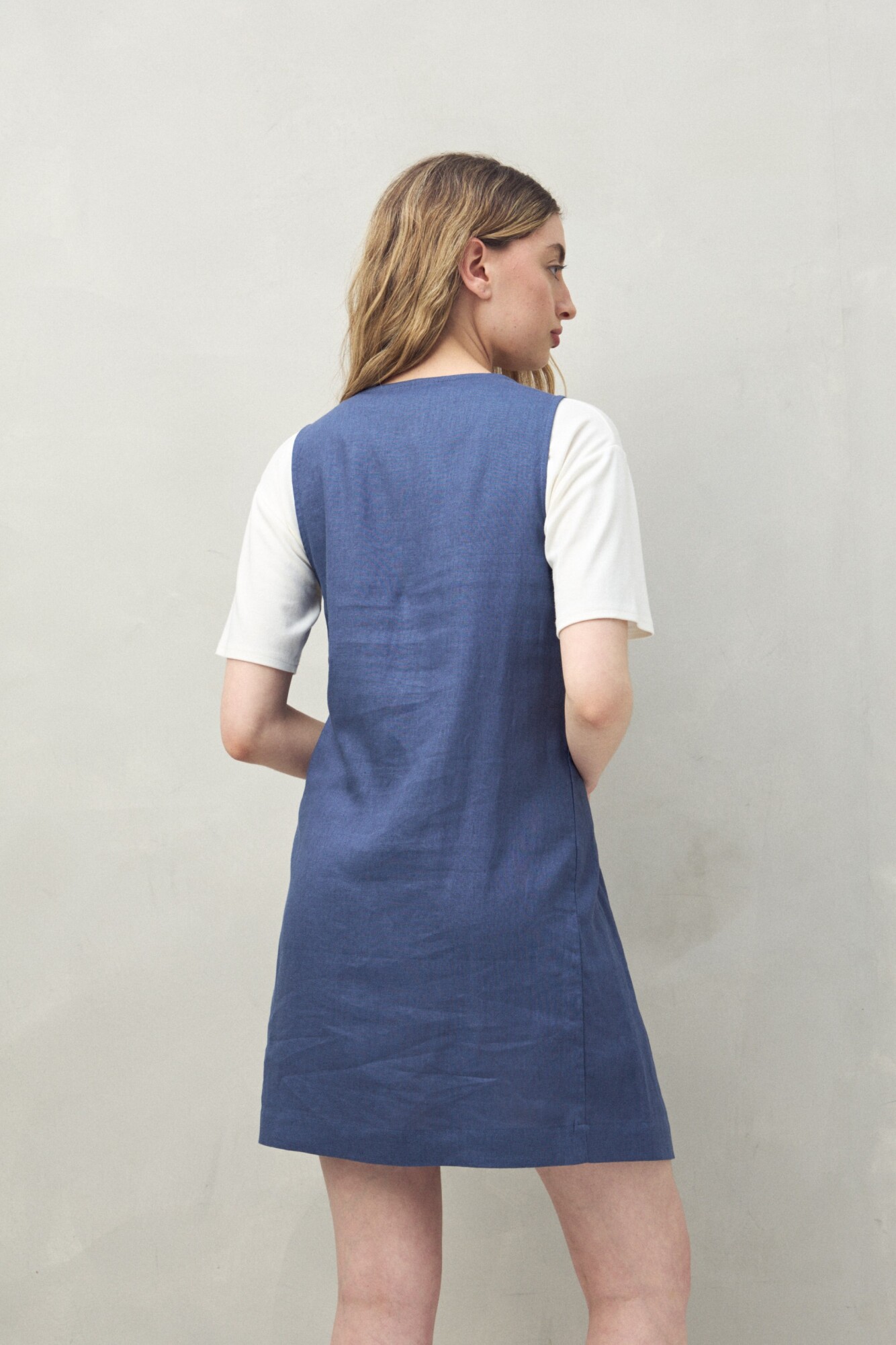 Vestido de lino con diseño de alforzas y escote con lazo, una prenda que combina movimiento y textura para un look fresco y femenino. Su silueta amplia realza la caída natural del lino, mientras que las alforzas verticales aportan estructura visual y un aire artesanal. Ideal para usar con botas o sandalias según el estilo que quieras lograr.