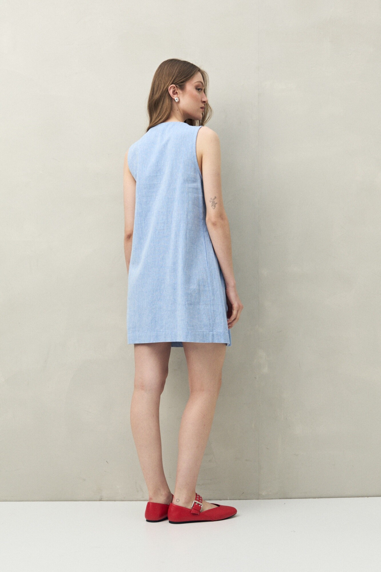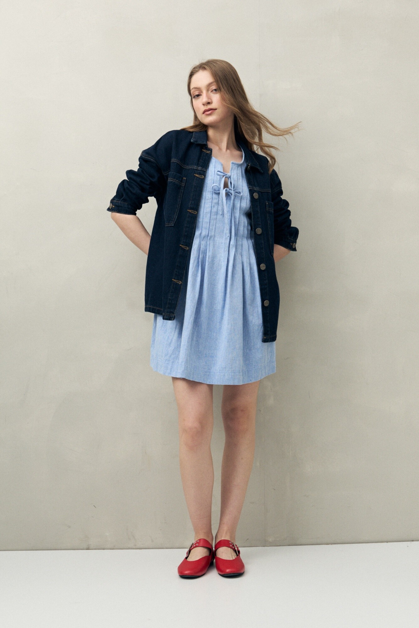 20 Vestido de lino con diseño de alforzas y escote con lazo, una prenda que combina movimiento y textura para un look fresco y femenino. Su silueta amplia realza la caída natural del lino, mientras que las alforzas verticales aportan estructura visual y un aire artesanal. Ideal para usar con botas o sandalias según el estilo que quieras lograr.
