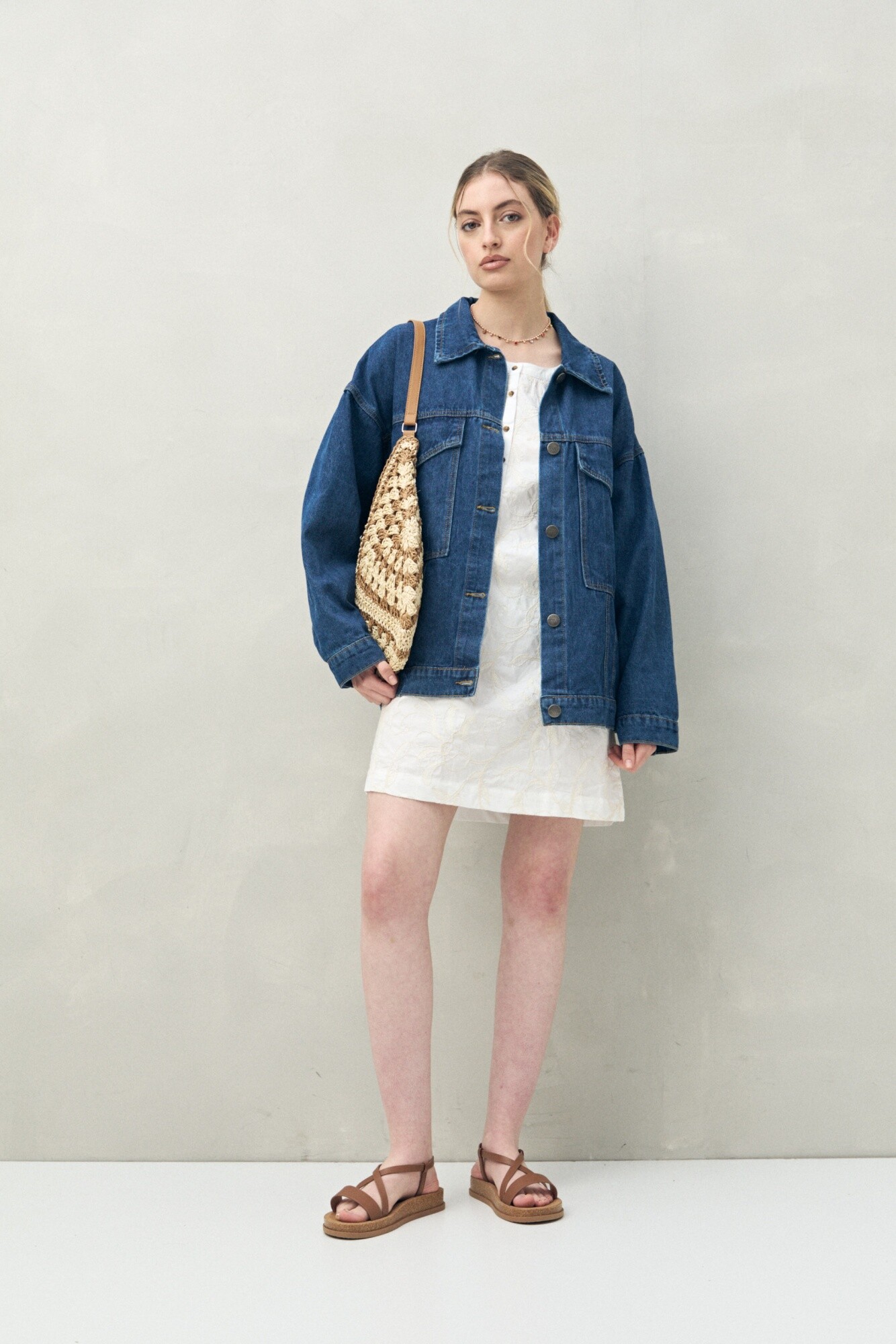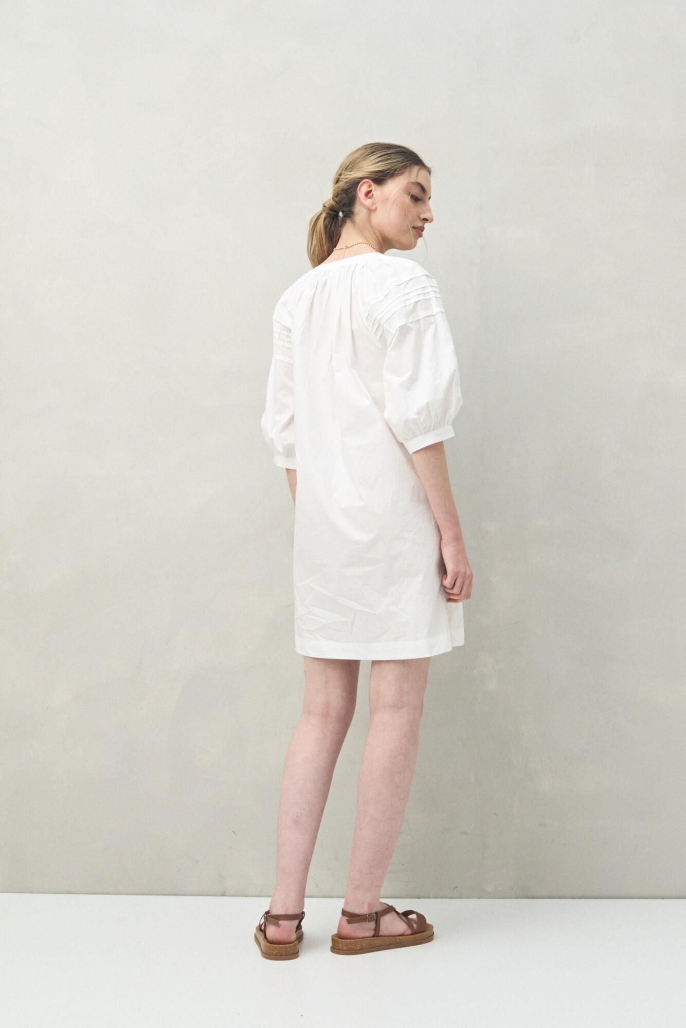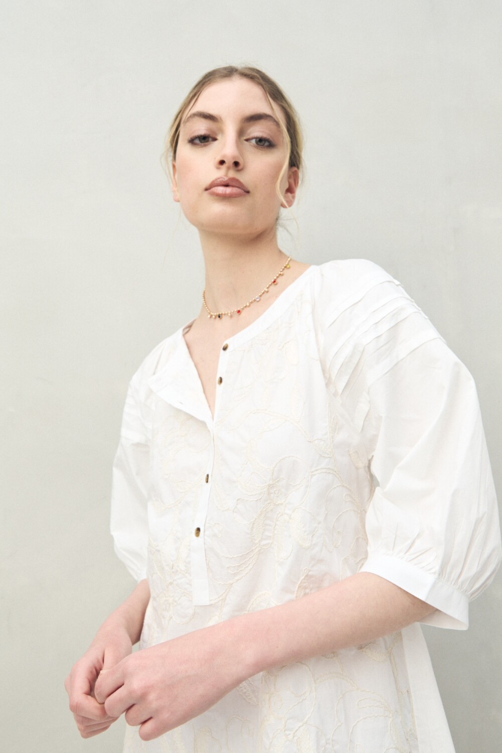 Vestido corto de algodón con bordado floral en relieve y escote redondo con abotonadura frontal. Las mangas amplias y los pliegues en los hombros aportan movimiento y un aire artesanal que lo vuelve ideal para un look femenino con inspiración bohemia.