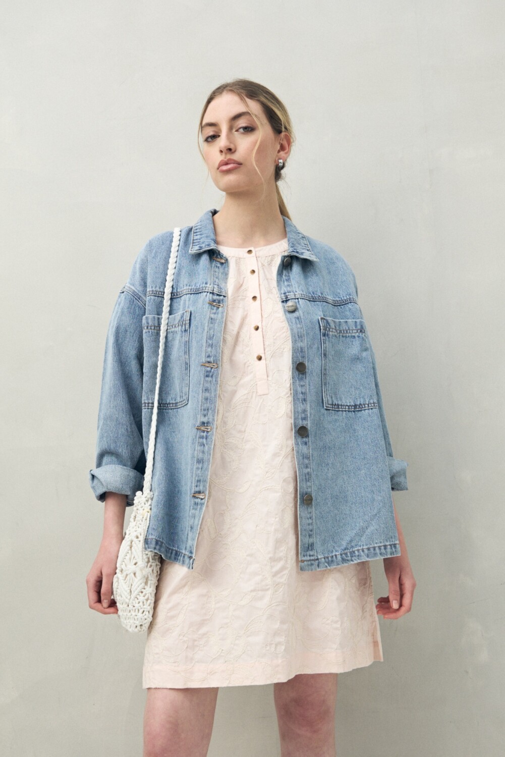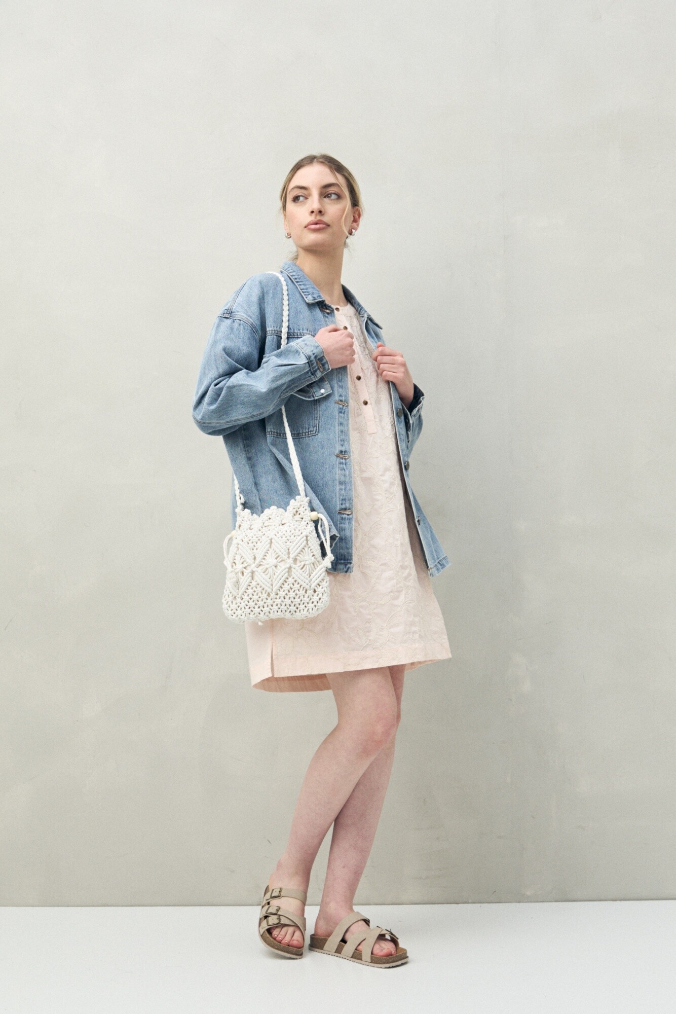 Vestido corto de algodón con bordado floral en relieve y escote redondo con abotonadura frontal. Las mangas amplias y los pliegues en los hombros aportan movimiento y un aire artesanal que lo vuelve ideal para un look femenino con inspiración bohemia.