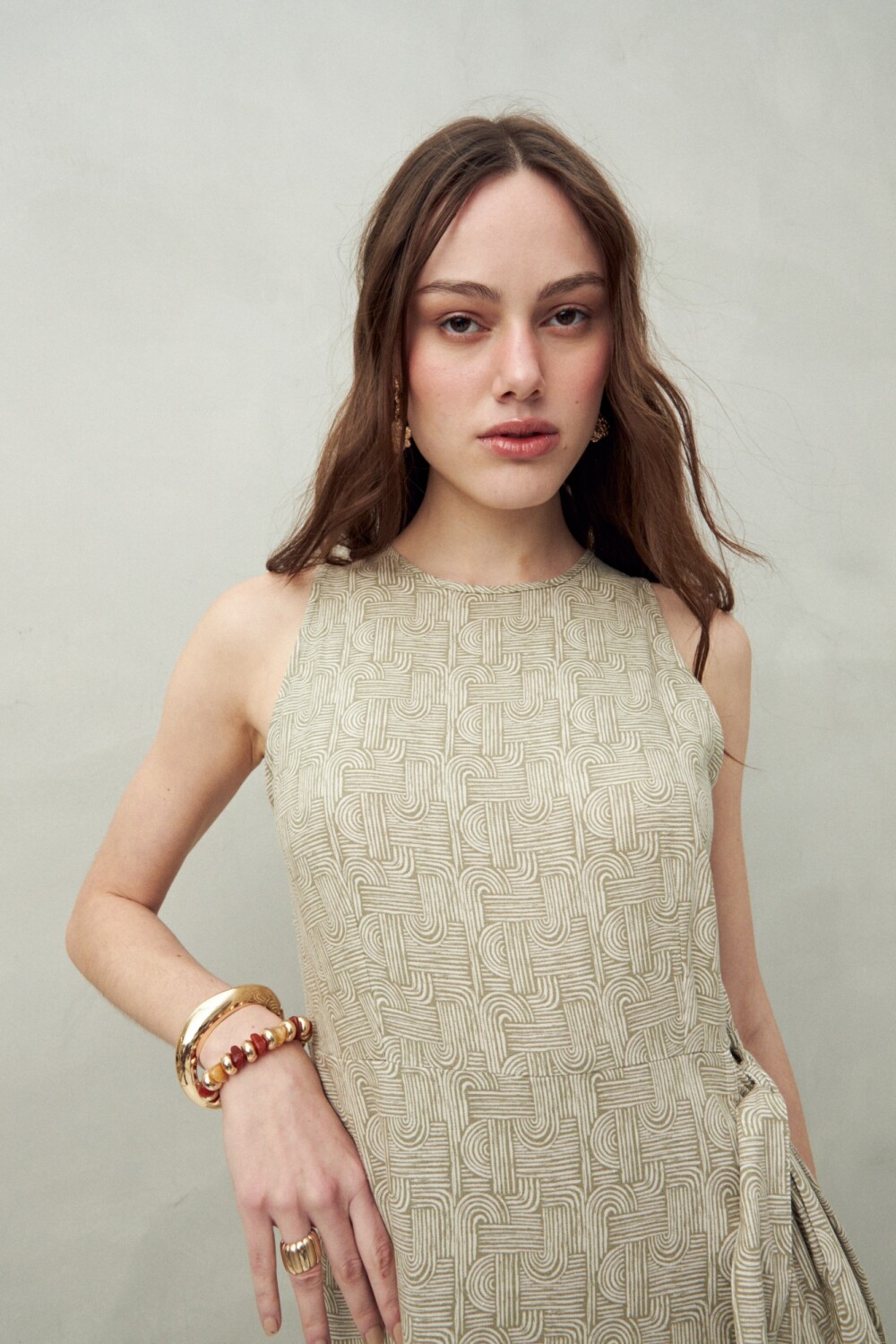 Confeccionado en una mezcla de lino y viscosa que le aporta caída fluida y textura natural, este modelo destaca por su silueta amplia y su diseño estampado, ideal para los días de verano. Su escote redondo y líneas limpias lo convierten en una pieza versátil, perfecta tanto para looks relajados de día como para un outfit más cuidado con accesorios.