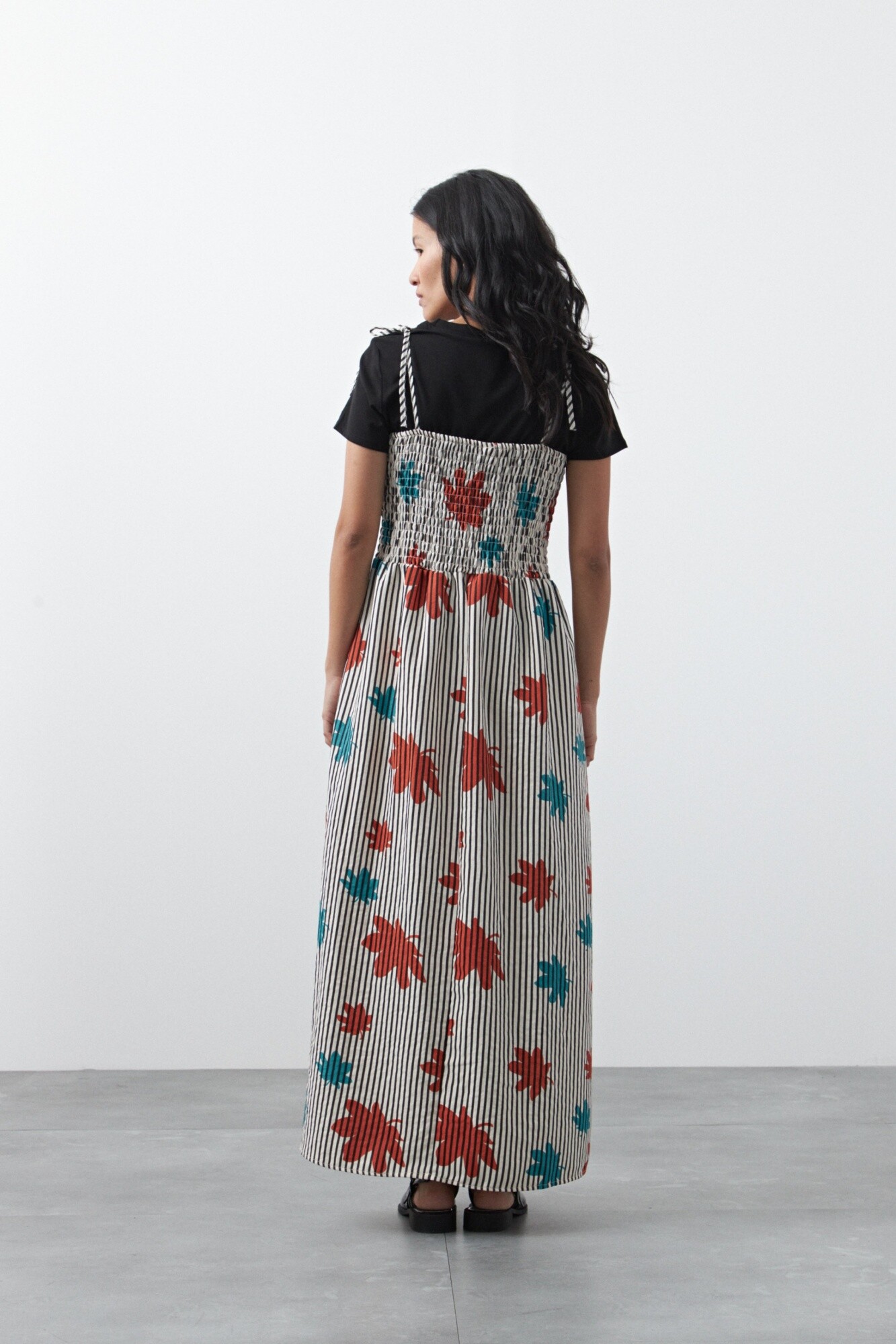 Vestido midi estampado de silueta fluida con cuerpo fruncido que aporta un calce cómodo y femenino. Presenta escote recto y tiras finas regulables que permiten un ajuste delicado, mientras que el corte bajo busto genera una caída suelta y liviana. El tejido acompaña el movimiento y resulta ideal para looks relajados de día o combinaciones más elevadas, clave para sumar un aire trendy sin esfuerzo.