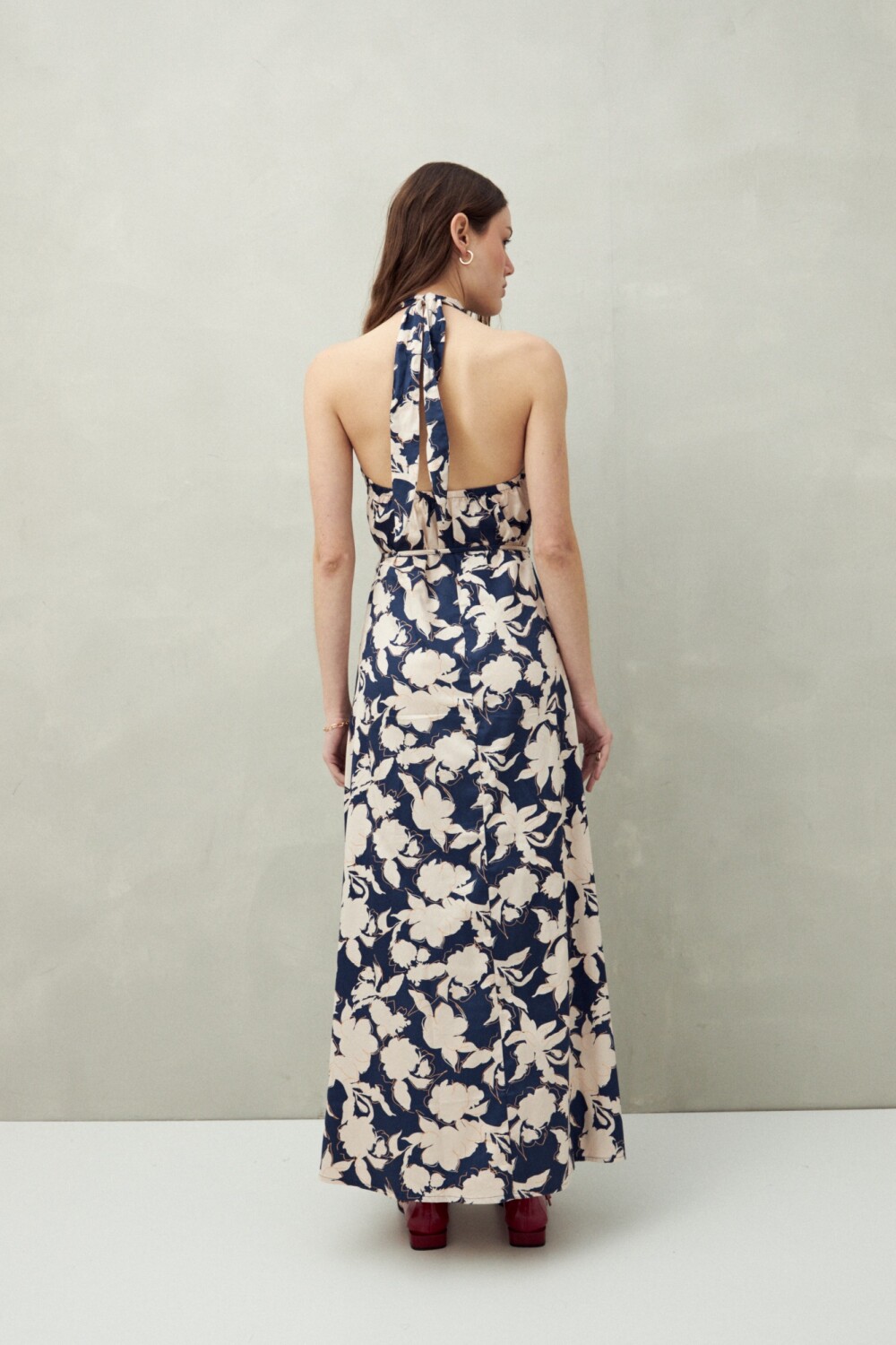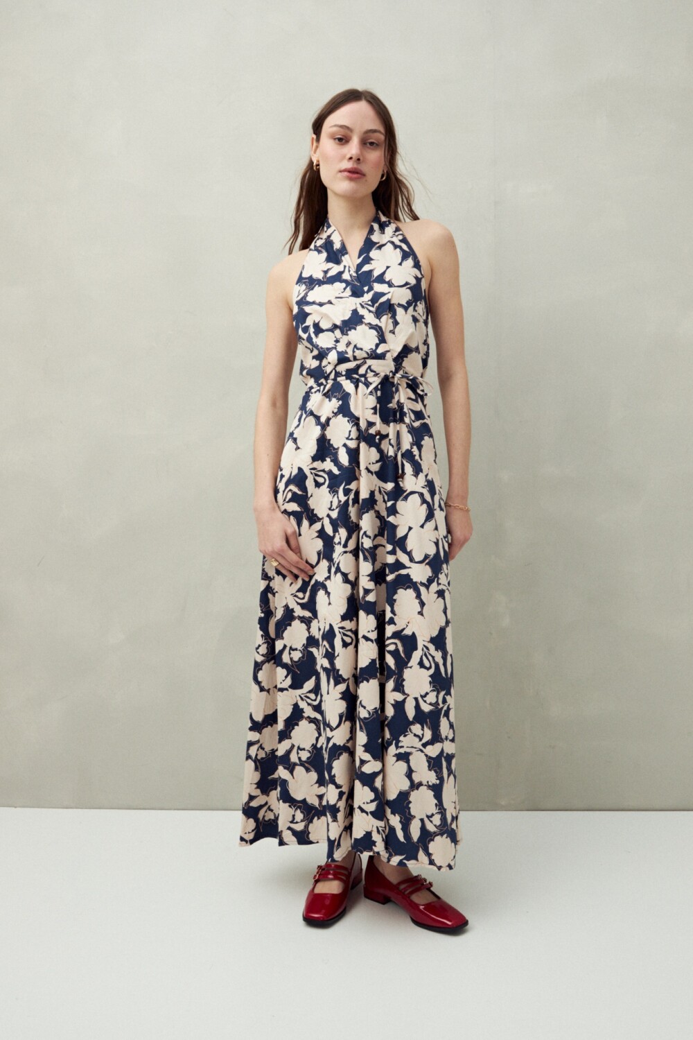 Vestido largo confeccionado en algodón liviano, con escote halter y lazo que se anuda al cuello. Su silueta fluida y cintura ajustable realzan la figura, evocando el encanto de los vestidos veraniegos de los años 50. Un diseño atemporal que equilibra frescura y elegancia.