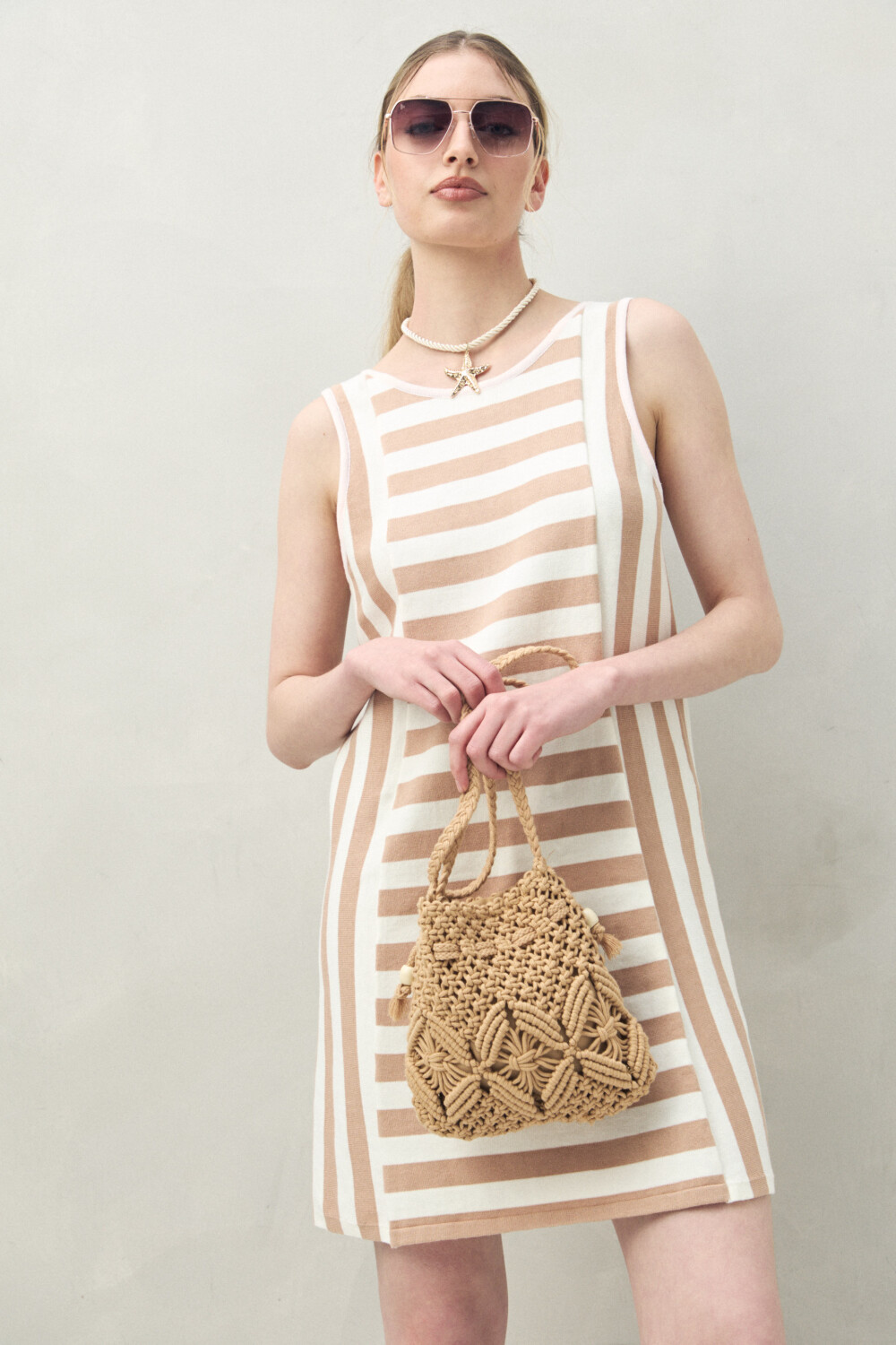 3517 Vestido de algodón con trama a rayas, un clásico reinterpretado en clave fresca y contemporánea. Su silueta recta acompaña el movimiento con total comodidad, mientras que el juego de direcciones en las rayas estiliza y aporta un toque visual súper trendy.