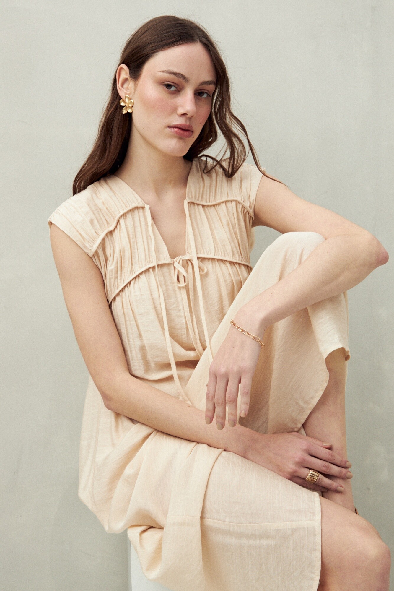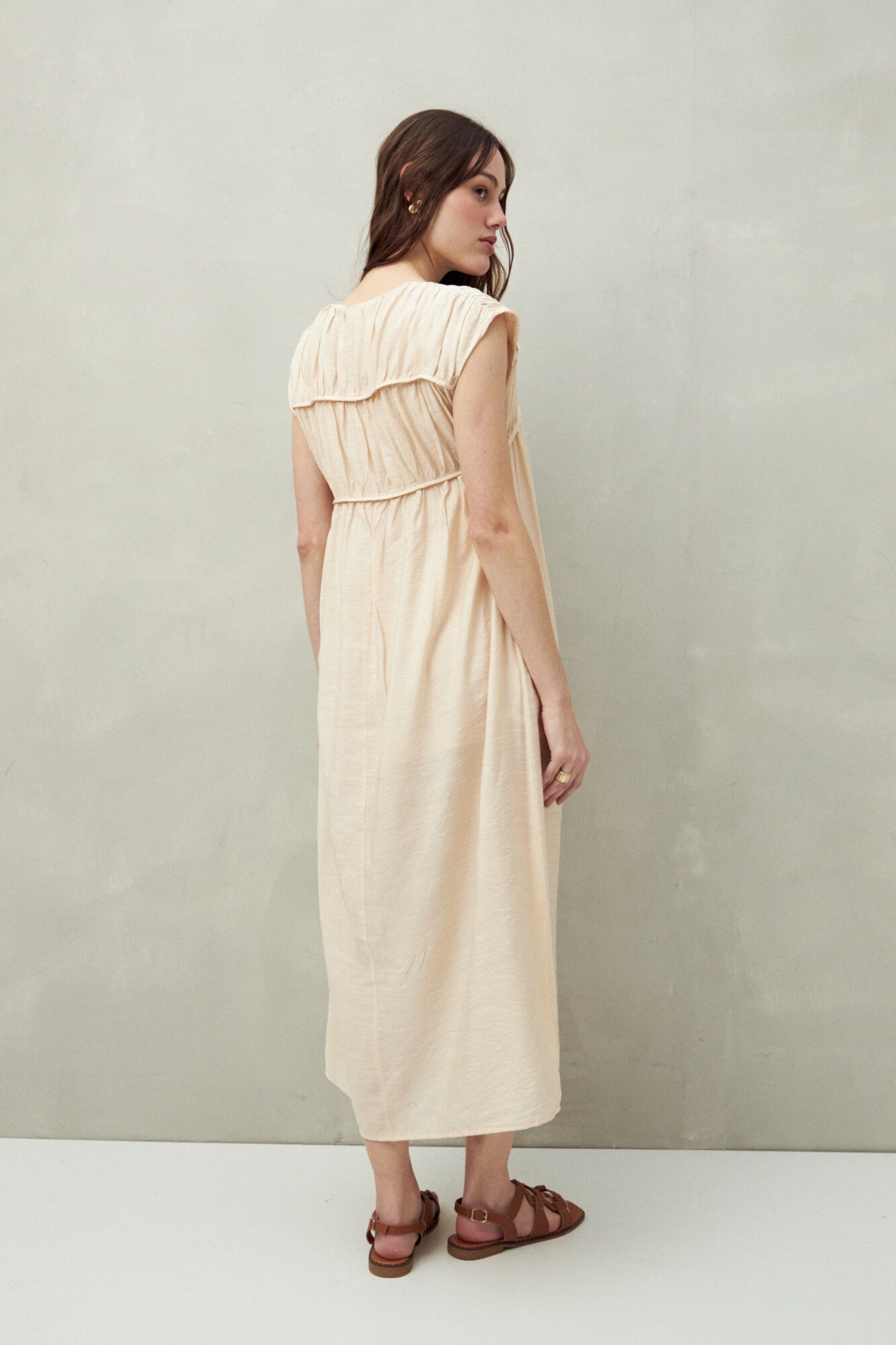 Vestido largo con diseño fluido y escote con lazo, que aporta un aire romántico y relajado. Su caída liviana realza el movimiento natural del tejido, mientras que las delicadas frunces en el pecho suman textura y volumen de forma sutil. Ideal para los días cálidos o para un look effortless con estilo.