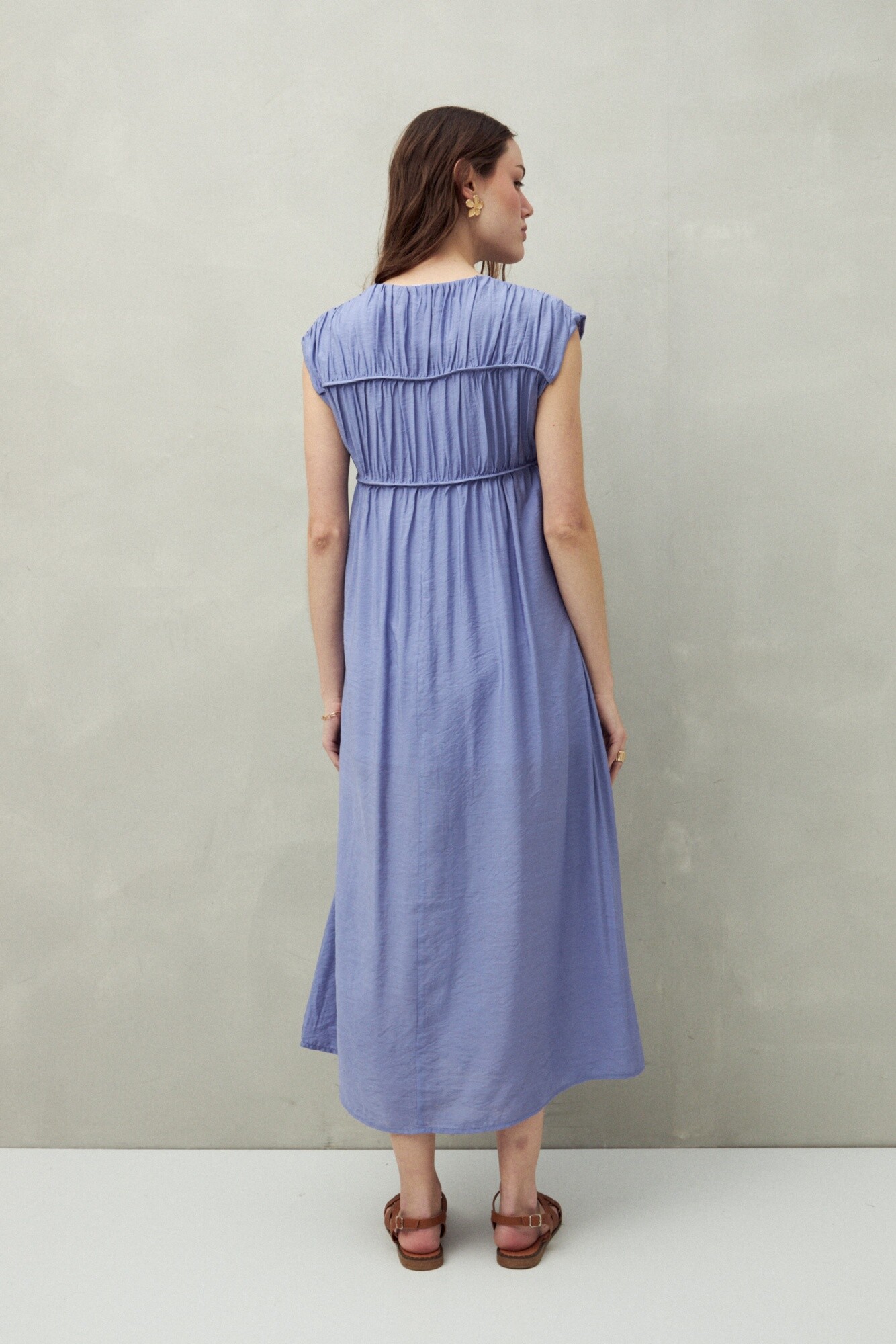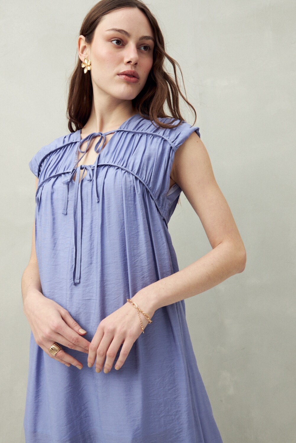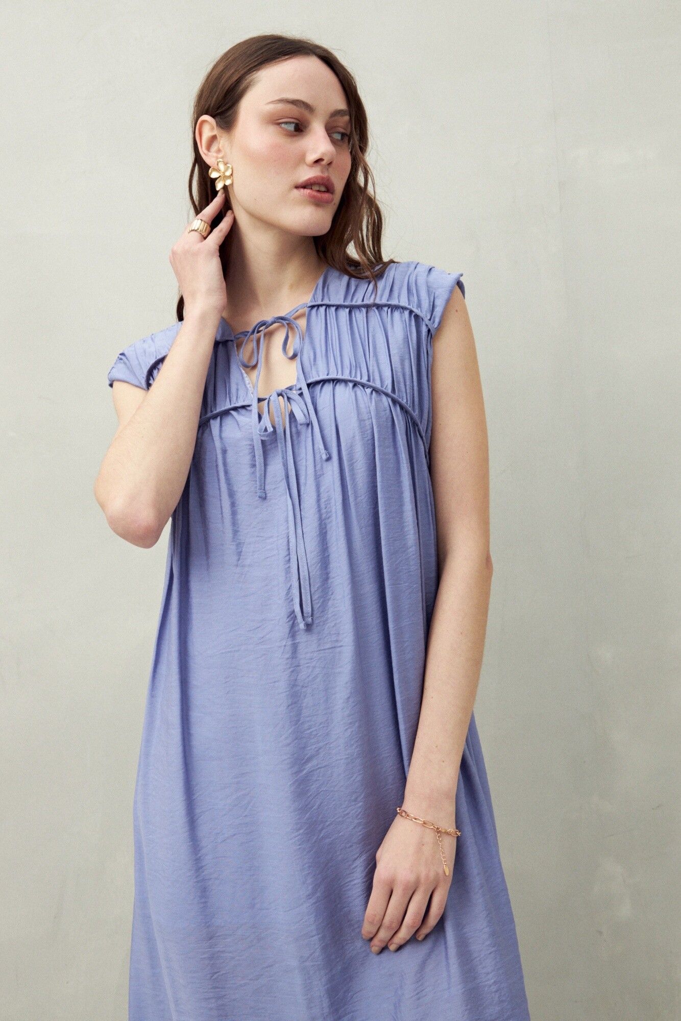 Vestido largo con diseño fluido y escote con lazo, que aporta un aire romántico y relajado. Su caída liviana realza el movimiento natural del tejido, mientras que las delicadas frunces en el pecho suman textura y volumen de forma sutil. Ideal para los días cálidos o para un look effortless con estilo.