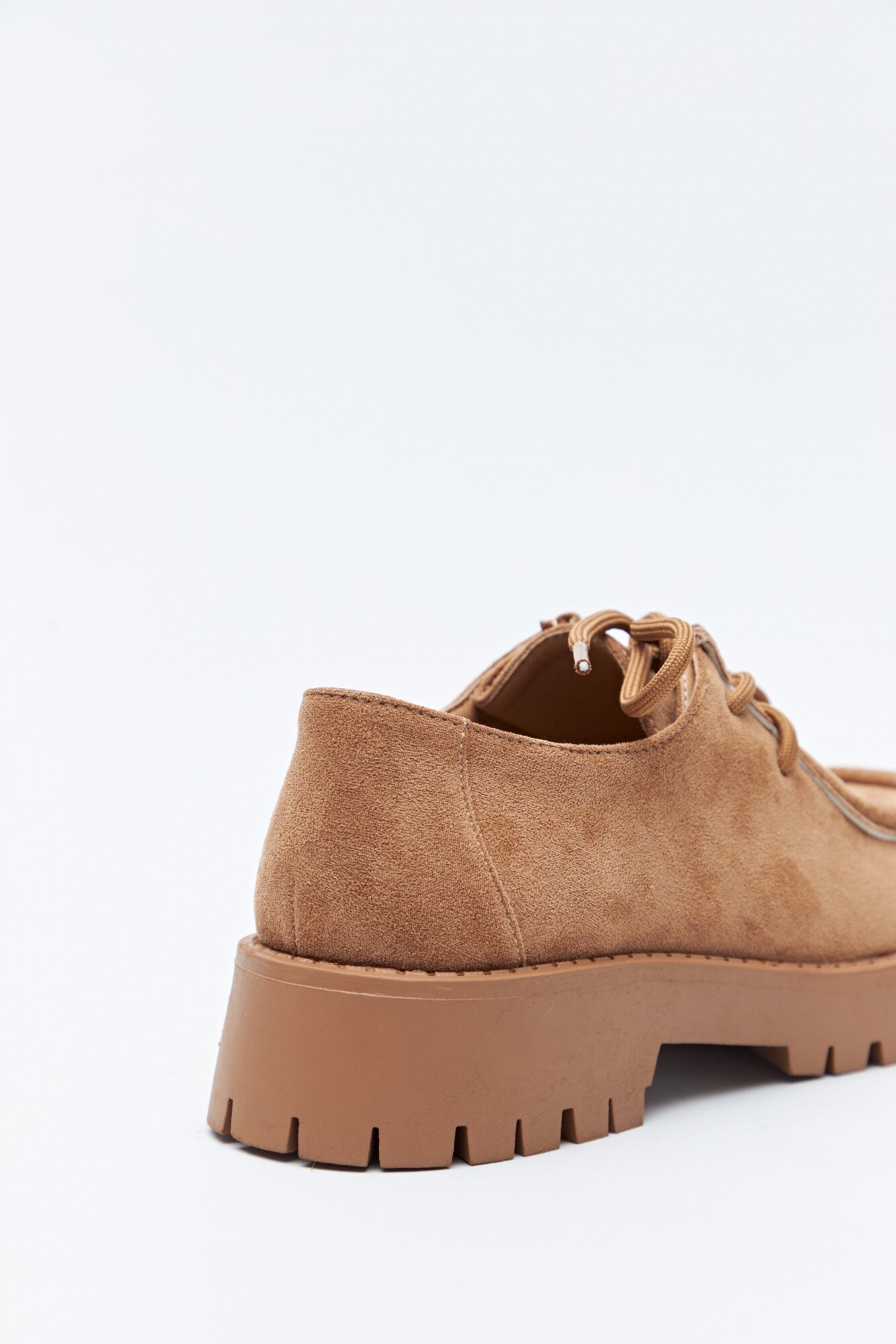 Zapatos de gamuza con cordones, un diseño de inspiración clásica reinterpretado con una estética contemporánea. Presentan puntera con costura marcada y una suela robusta con relieve que aporta carácter y estabilidad al caminar. Un modelo versátil que combina comodidad y estilo, ideal para acompañar distintos looks de temporada.